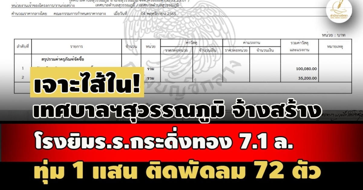 โครงการนี้ มีชื่อเป็นทางการว่า งานประกวดราคาจ้างก่อสร้างโครงการก่อสร้างอาคารอเนกประสงค์ขนาดเล็ก มีชั้นลอย แบบตอกเสาเข็ม โรงเรียนกระดิ่งทอง (เทศบาล๒) เทศบาลตำบลสุวรรณภูมิ อำเภอสุวรรณภูมิ จังหวัดร้อยเอ็ด ด้วยวิธีประกวดราคาอิเล็กทรอนิกส์ (e-bidding) กำหนดราคากลาง 8,378,380.34 บาท