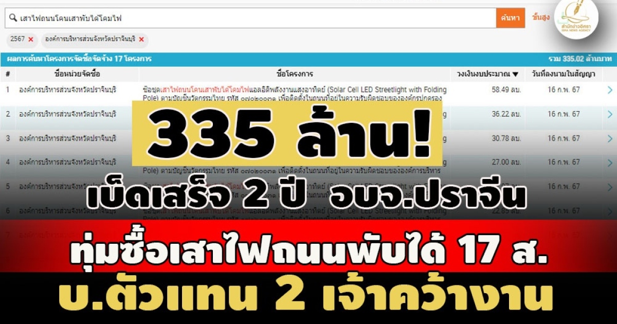 "...สำนักข่าวอิศรา สืบค้นฐานข้อมูลจัดซื้อจัดจ้างหน่วยงานภาครัฐ เว็บภาษีไปไหน พบว่า นับตั้งแต่ช่วงเดือนต.ค.2566 - 16 ก.พ. 2567 อบจ.ปราจีนบุรี ได้ทำสัญญาจัดซื้อ ชุดเสาไฟถนนโคนเสาพับได้โคมไฟแอลอีดีพลังงานแสงอาทิตย์ (Solar Cell LED Streetlight with Folding Pole) ซึ่งเป็นสินค้าในบัญชีนวัตกรรมไทย ไปแล้ว จำนวน 17 โครงการ รวมวงเงิน 335.02 ล้านบาท..."
