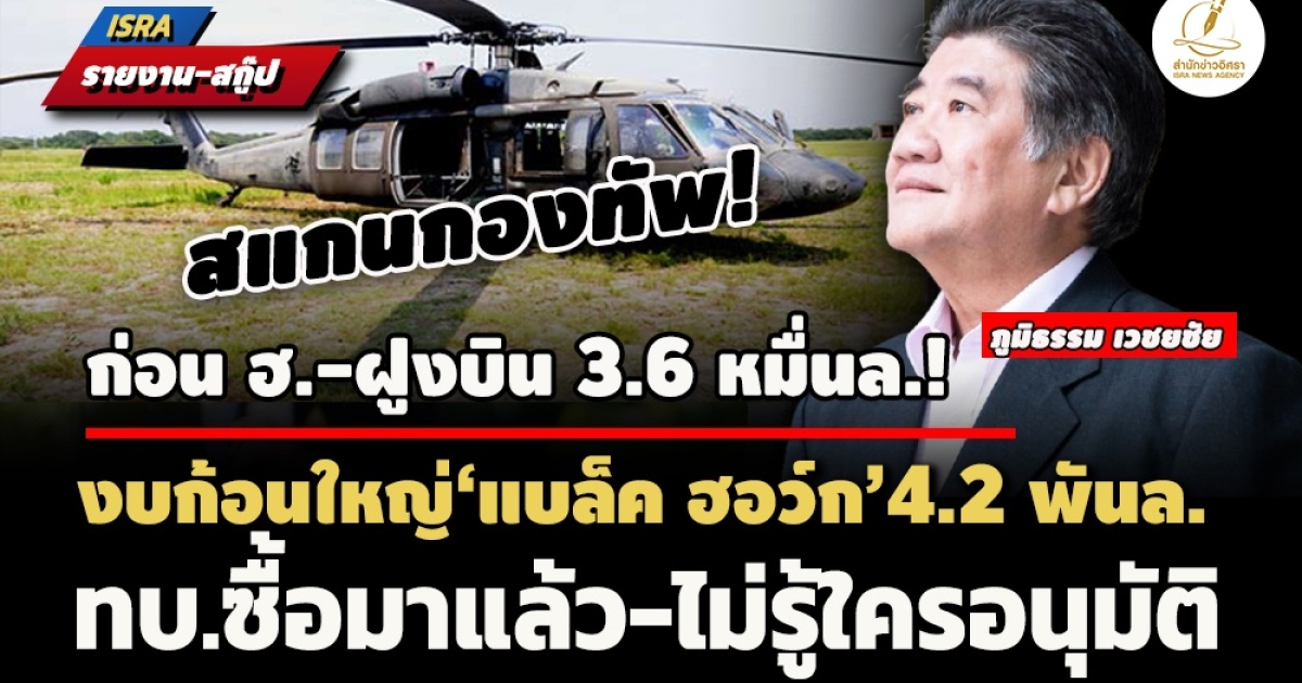 สแกนงบก้อนใหญ่กองทัพ ก่อน ครม.อุ๊งอิ๊ง 15 ต.ค.67 เห็นชอบ สำนักนายกฯ-ทอ. ช็อปฯ เฮลิคอปเตอร์-ฝูงบินขับไล่ 36,760 ล. ก่อนหน้า ปี 2564 ทัพบก จัดซื้อ แบล็ค ฮอว์ก 4 ลำ 4.2 พัน ล. จากสหรัฐ ไม่รู้ใครอนุมัติ ไม่รวม AW กว่าสิบลำ ขณะที่ ทร. เรือดำน้ำ ยังไม่จบ