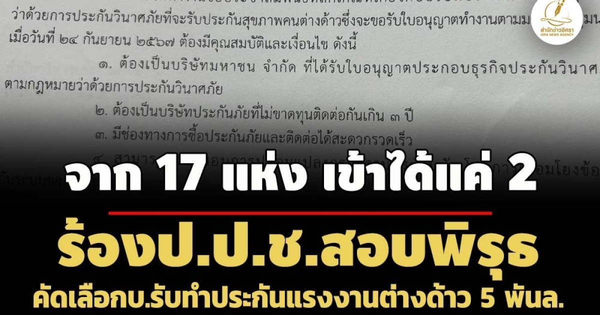 ร้อง ป.ป.ช. สอบกรมการจัดหางานกำหนดเงื่อนไขคัดเลือกบริษัทรับทำประกันสุขภาพแรงงานต่างด้าวใหม่ วงเงินสูงกว่า 5 พันล้าน ส่อพิรุธกำหนดคุณสมบัติ 13 ประการ ไม่เปิดกว้าง กีดกัน เอื้อประโยชน์ จาก 17 แห่ง เข้าร่วมได้แค่ 2 - จับตาประกาศผล 19 พ.ย.นี้