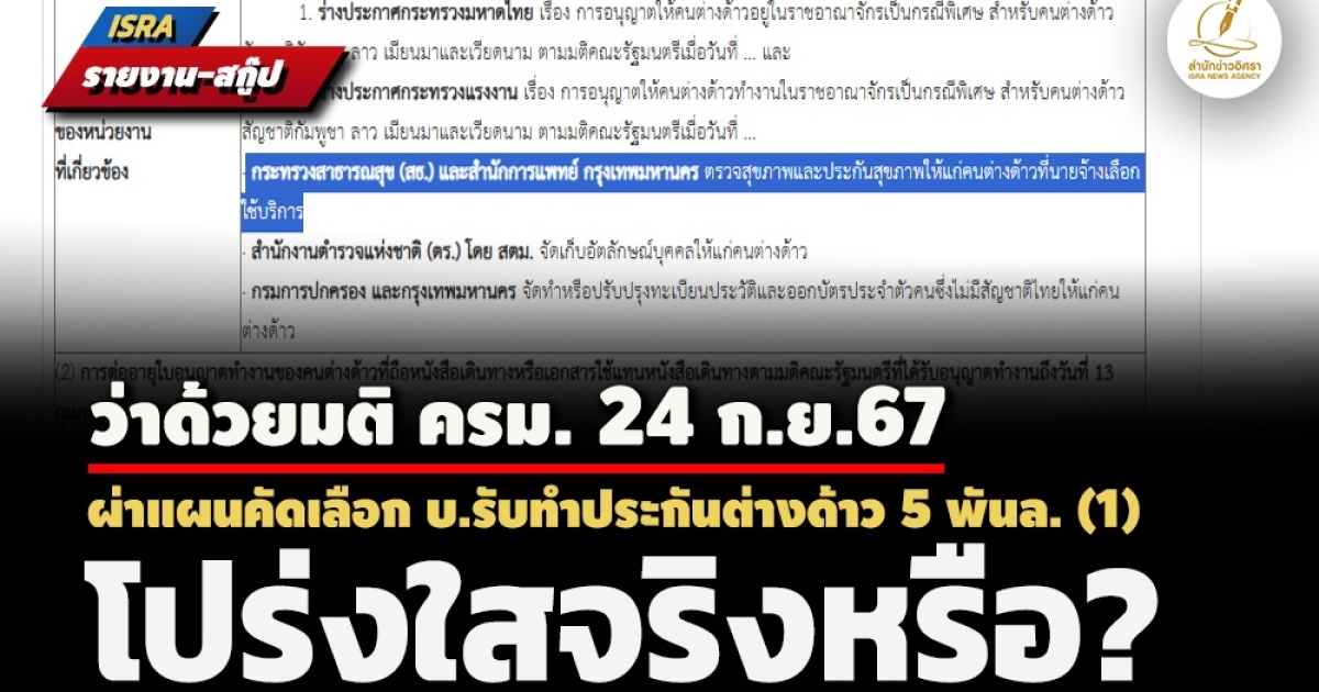 เพราะเป็นเรื่องที่น่าสนใจ ว่าในขณะที่กรมการจัดหางาน อ้างถึงมติ ครม. วันที่ 24 ก.ย.2567 นี้เป็นกรอบในการดำเนินงาน แต่ผลสรุปการประชุม ครม. เมื่อวันที่ 24 ก.ย.2567 ที่เผยแพร่ผ่านทางเว็บไซต์รัฐบาลไทย https://www.thaigov.go.th/ ถึงไม่มีรายละเอียดเรื่องการทำประกันสุขภาพแรงงานต่างด้าวไว้ ทั้งที่ เรื่องนี้เป็นเรื่องใหญ่ มีผลต่อ แรงงานต่างด้าวกว่า 3 ล้านคน มูลค่าวงเงินการทำประกันสุขภาพแรงงานต่างด้าว สูงถึงกว่า 5 พันล้านบาท