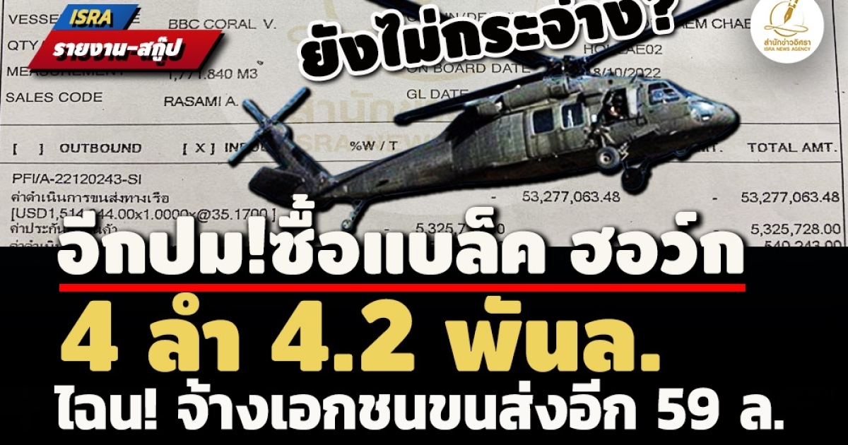 เปิดข้อมูลอีกปมยังไม่กระจ่าง กรณีจัดซื้อเฮลิคอปเตอร์ แบล็คฮอว์ก 4 ลำ 4.2 พันล. ปี 2564 โดยวิธี FMS ความช่วยเหลือทางทหารจากสหรัฐ ไฉน!จ้างเอกชนขนส่งอีก 59 ล. ผ่านความเห็นชอบ ก.กลาโหมหรือไม่ ?
