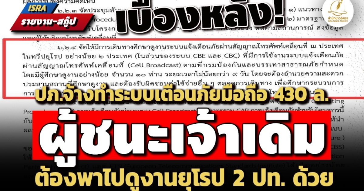 ล่าสุด สำนักข่าวอิศรา ตรวจสอบรายละเอียดการจัดซื้อจัดจ้างโครงการพัฒนาระบบแจ้งเตือนภัยผ่านสัญญาณโทรศัพท์เคลื่อนที่ วงเงิน 430,000,000 บาท ที่ทำสัญญาว่าจ้าง บริษัทเรย์แด้นท์ อินเตอร์เนชั่นแนล จำกัด เมื่อวันที่ 27 มีนาคม 2568