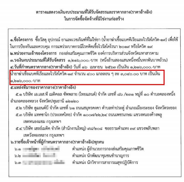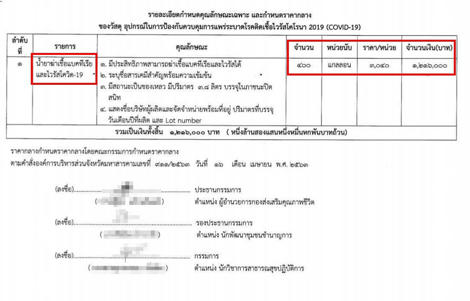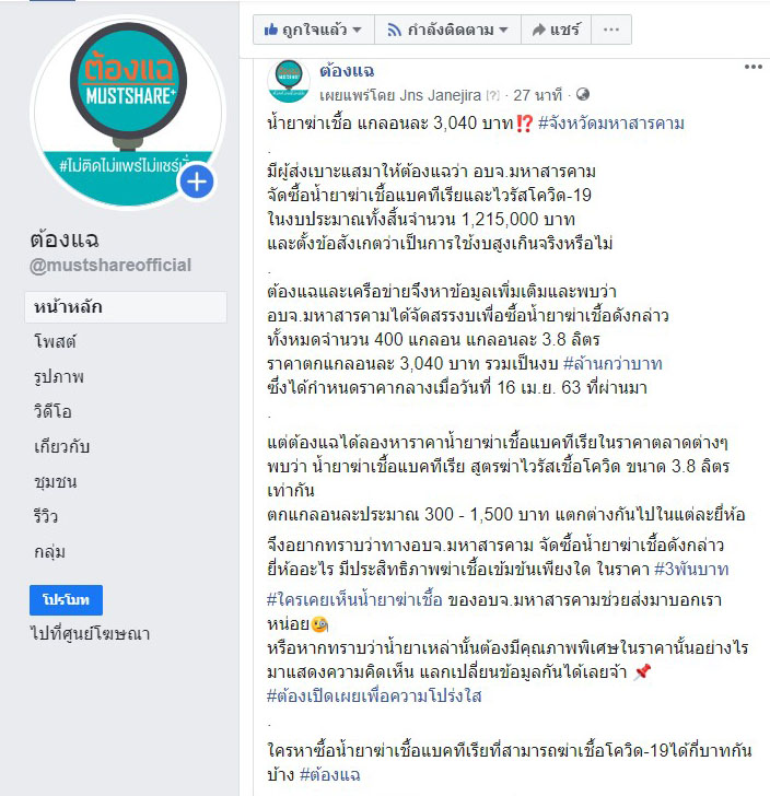 เบื้องต้น เพจต้องแฉและเครือข่ายได้หาข้อมูลเพิ่มเติมและพบว่า อบจ.มหาสารคาม ได้จัดสรรงบเพื่อซื้อน้ำยาฆ่าเชื้อดังกล่าว ทั้งหมดจำนวน 400 แกลอน แกลอนละ 3.8 ลิตร ราคาตกแกลอนละ 3,040 บาท รวมเป็นงบล้านกว่าบาท ซึ่งได้กำหนดราคากลางเมื่อวันที่ 16 เม.ย. 63 ที่ผ่านมา