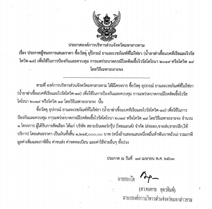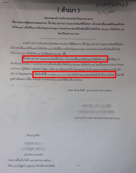 อย่างไรก็ดี จากการขยายผลการตรวจสอบฐานข้อมูลจัดซื้อจัดจ้างหน่วยงานรัฐ เพื่อยืนยันข้อมูลการจัดซื้อดังกล่าว พบว่า เมื่อวันที่ 17 เม.ย. 2563 ที่ผ่านมา อบจ.มหาสารคาม ได้เผยแพร่ประกาศจัดซื้อน้ำยาฆ่าเชื้อแบคทีเรียและไวรัสโควิด-19 ด้วยวิธีเฉพาะเจาะจง ในงบประมาณทั้งสิ้นจำนวน 1,215,000 บาท จากบริษัท สยามอินเตอร์กรุ๊ป (ไทยแลนด์) จำกัด