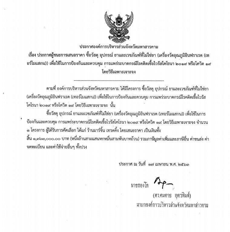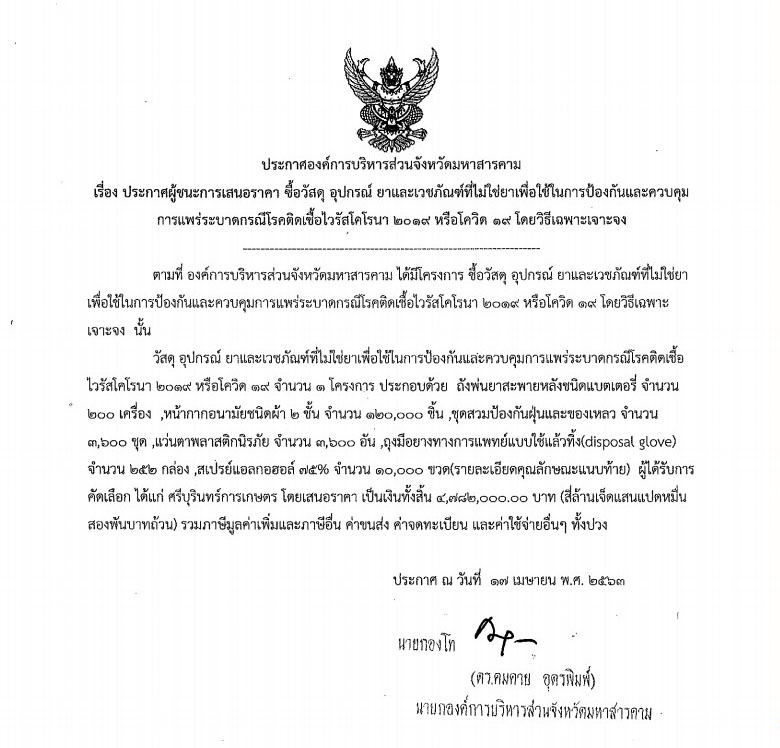 จากการตรวจสอบยังพบว่า ในวันที่ 17 เม.ย. 2563 อบจ.มหาสารคาม ยังประกาศผลจัดซื้อวัสดุ อุปกรณ์ ยาและเวชภัณฑ์เพื่อใช้ในการป้องกันโรคโควิด ด้วยวิธีเฉพาะเจาะจง จำนวน 2 สัญญา