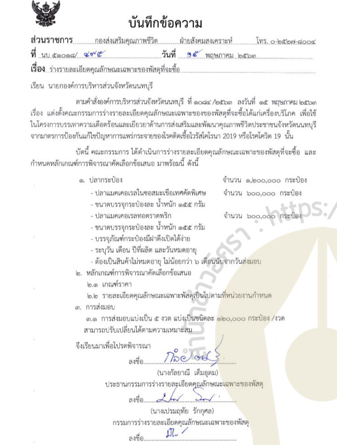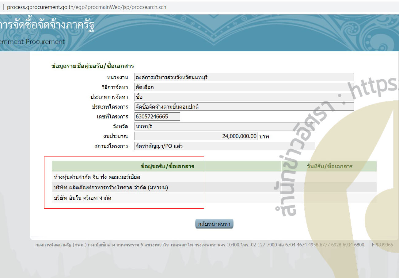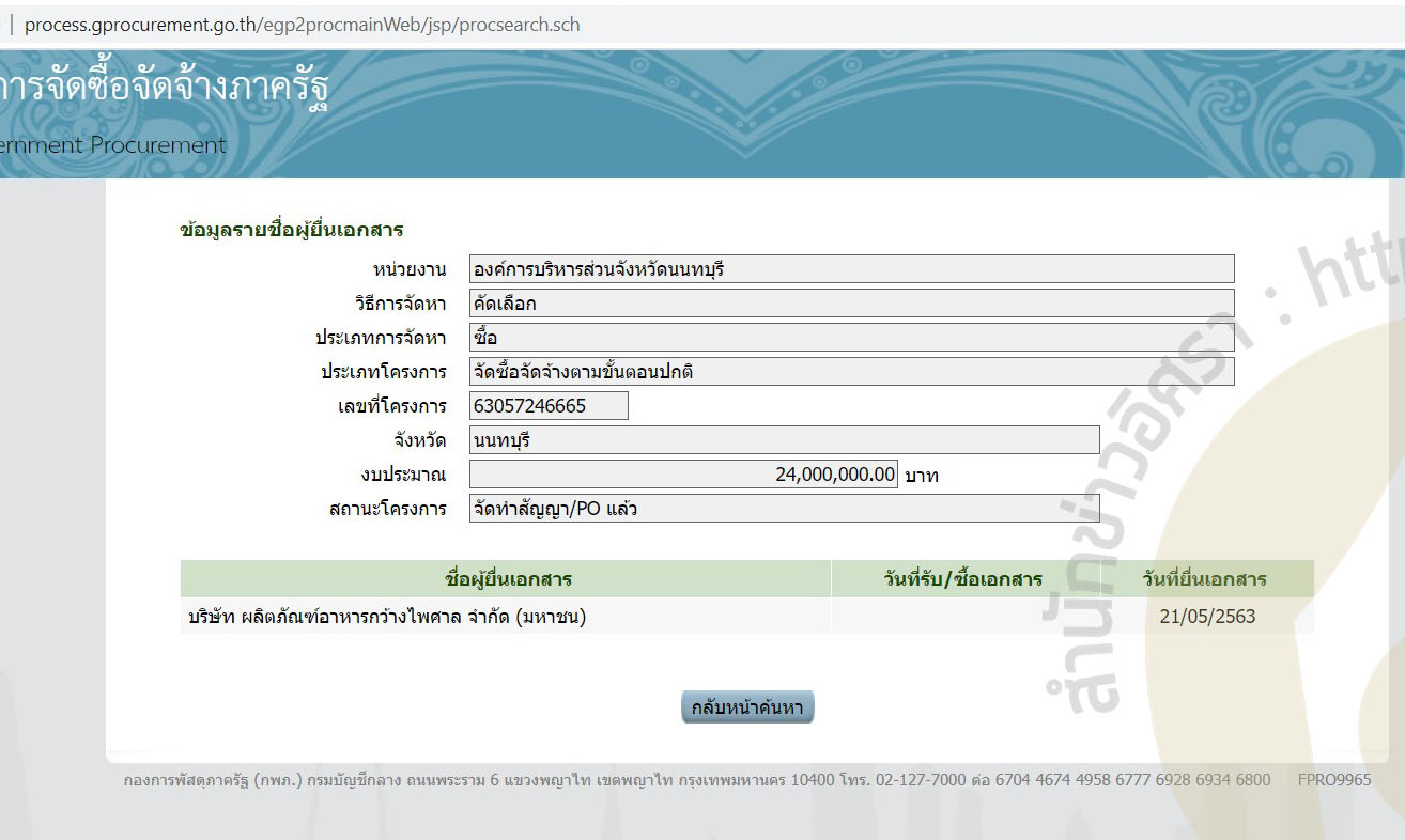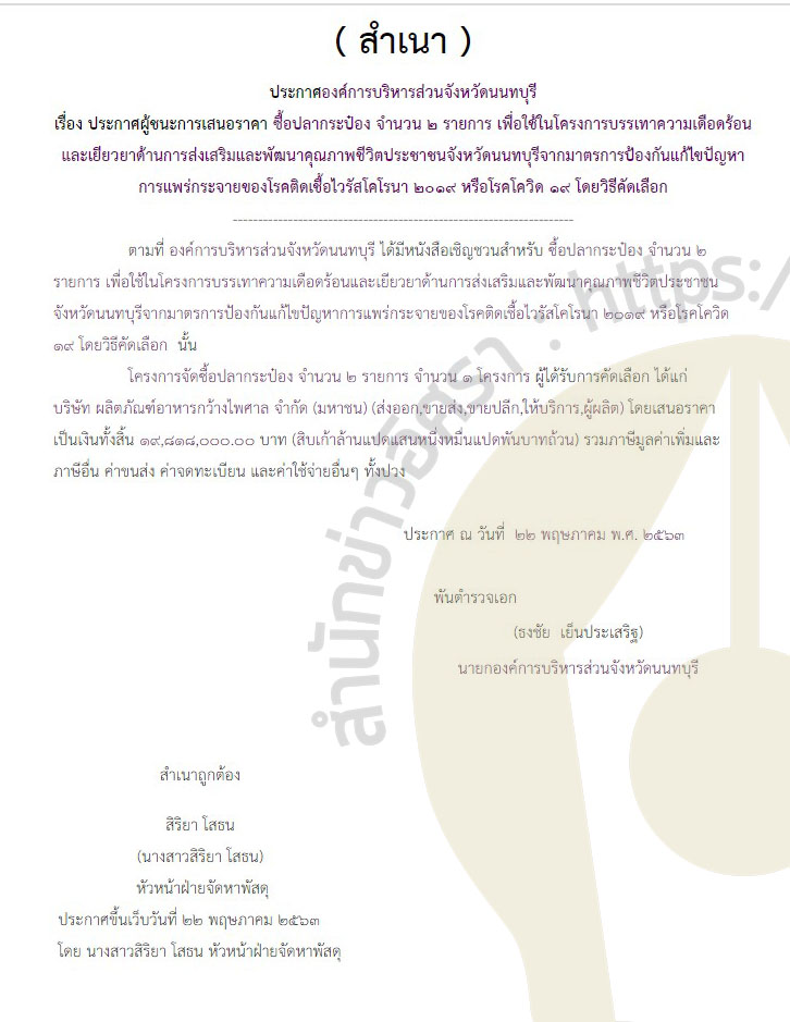 เบื้องต้น อบจ.นนทุบรี พิจารณาผลและประกาศให้ บริษัท ผลิตภัณฑ์อาหารกว้างไพศาล จำกัด (มหาชน) เป็นผู้ชนะ ด้วยราคา 19,818,000 บาท ปัจจุบันส่งมอบงานครบถ้วนแล้ว (ดูเอกสารประกอบ)