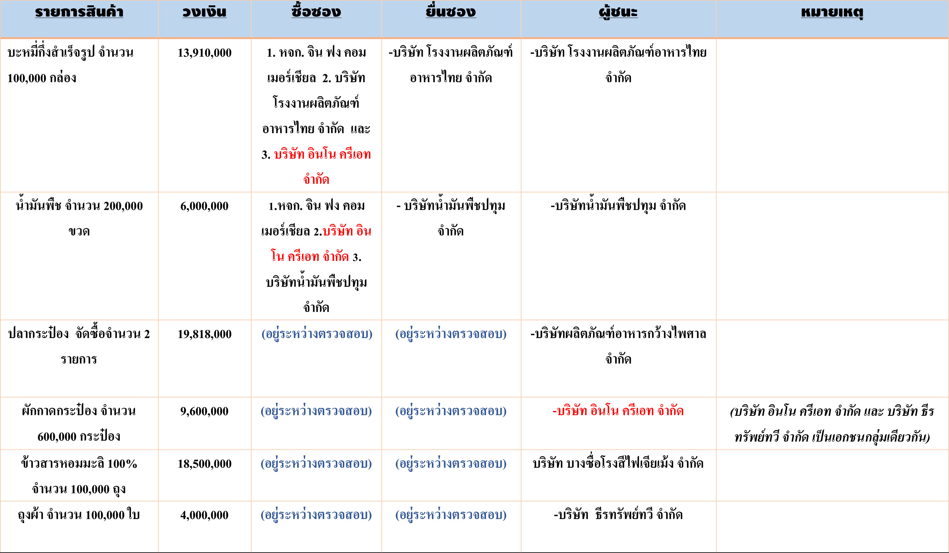 แต่ปรากฎว่า หจก.จิน ฟง คอมเมอร์เชียล จดทะเบียนทำธุรกิจการค้าเครื่องเขียน,แบบเรียน แบบพิมพ์ เครื่องใช้สำนักงาน อุปกรณ์การเรียนการสอน และ บริษัท อินโน ครีเอท จำกัด จดทะเบียนทำธุรกิจขายส่งกระดาษ หนังสือ และเครื่องเขียน ปรากฎชื่อเข้าซื้อซองการเสนอราคาขาย บะหมี่กึ่งสำเร็จรูป และ น้ำมันพืช ด้วย แต่ไม่ยื่นซองเสนอราคา
