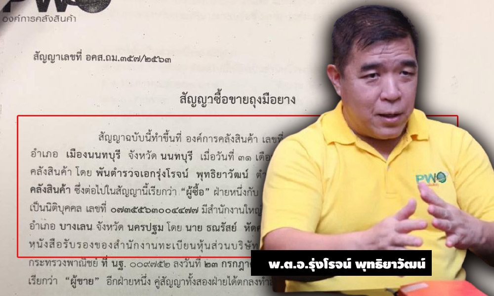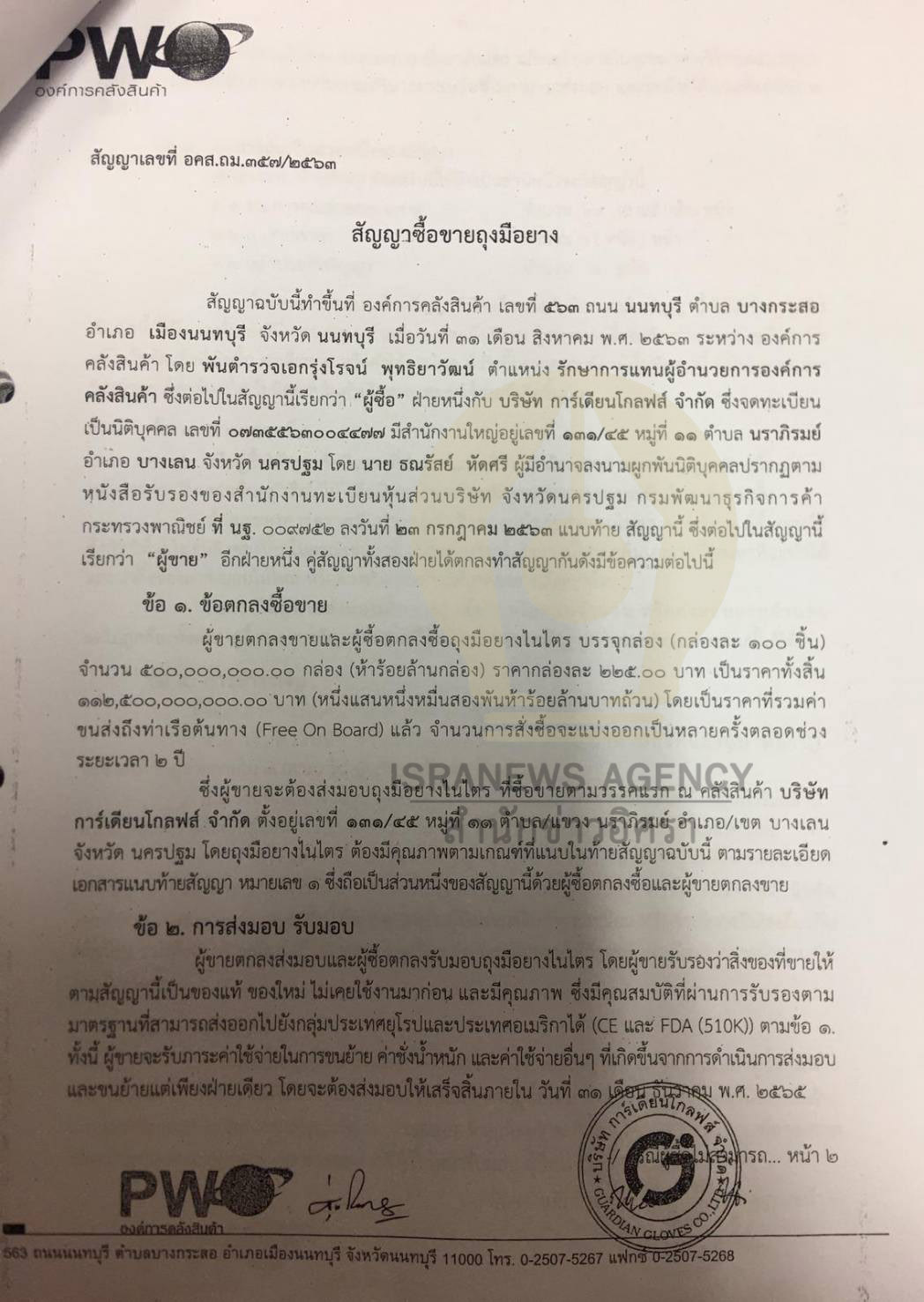 "...สัญญาซื้อขายถุงมือยางดังกล่าว ระหว่าง อคส. กับบริษัท การเดียนโกลฟส์ จำกัด ทำขึ้นเมื่อวันที่ 31 ส.ค.2563 ซื้อขายถุงมือยางไนไตร บรรจุกล่อง (กล่องละ 100 ชิ้น) จำนวน 500 ล้านกล่อง ราคากล่องละ 225 บาท เป็นราคาทั้งสิ้น 112,500 ล้านบาท เป็นราคาที่รวมค่าขนส่งถึงท่าเรือต้นทาง (Free On Board) จำนวนการสั่งซื้อจะแบ่งออกเป็นหลายครั้งตลอดช่วงระยะเวลา 2 ปี และต้องเป็นของแท้ ของไม่เคยใช้งานมาก่อน และมีคุณภาพ..."