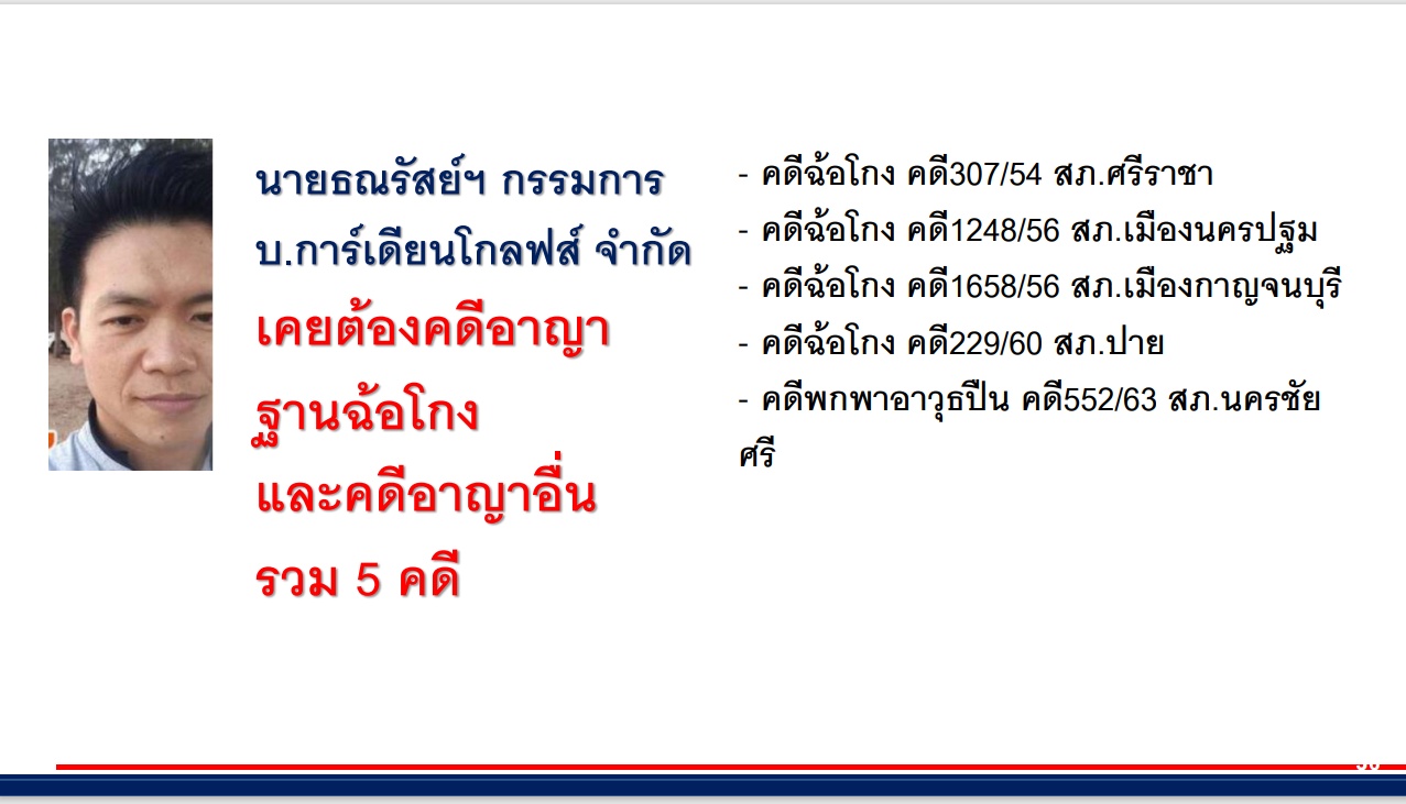 6. นายธณรัสย์ เจ้าของบริษัทการ์เดี้ยน โกลฟส์ ก็พบว่ามีเคยมีประวัติคดีฉ้อโกงอยู่ 4 คดี และคดีพกอาวุธผิดอีก 1 คดี (ดูภาพประกอบ)
