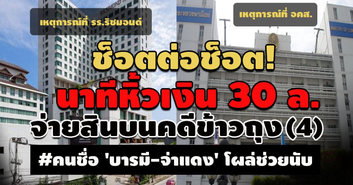 ตอนต่อไปนี้ เป็นข้อมูลลำดับเหตุการณ์การรวบรวมเงินจำนวน 30 ล้านบาท ของ บริษัทเจียเม้ง จํากัด เพื่อนำไปส่งมอบให้กับ นายชนุตร์ปกรณ์ จําเลยที่ 1 ที่โรงแรมริชมอนด์ ตามที่มีการนัดหมายไว้ ซึ่งมีการรวบรวมเงินมาจากหลายส่วน เมื่อไปถึงที่นัดหมายพบว่า มีตัวละคร ที่ชื่อว่านายบารมี และจ่าแดง (ไม่ทราบนามสกุล) มาคอยพบ และตรวจสอบจำนวนเงิน ขณะที่ในช่วงเวลาเดียวกัน บริษัทเจียเม้ง จํากัด ได้ส่งตัวแทนไปรับเช็คคืนเงินค่าข้าวจํานวน 131,200,000 บาท ที่สำนักงาน อคส. ด้วย