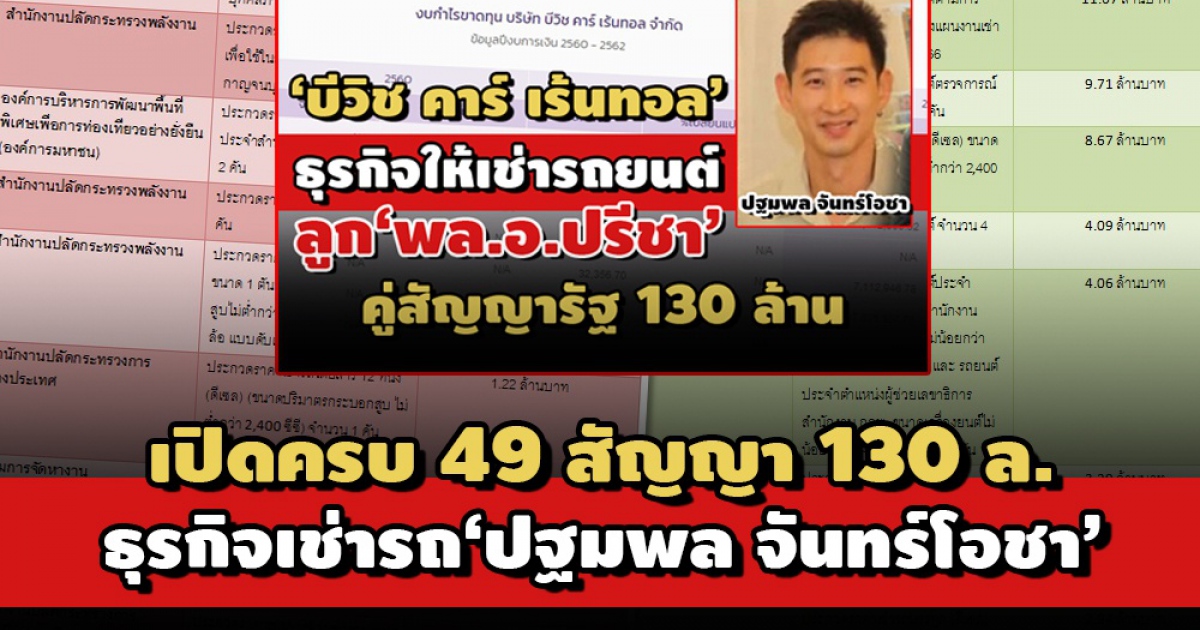 ชำแหละละเอียด! 49 สัญญา 130 ล้าน บ.บีวิช คาร์ เร้นทอล ธุรกิจให้เช่ารถยนต์ ‘ปฐมพล จันทร์โอชา’ นั่ง กก.-ถือหุ้น 16.6667% บุตรชาย ‘พล.อ.ปรีชา’ มีหน่วยงานรัฐไหนบ้าง?