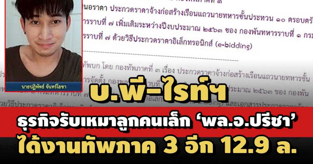 บ.พี-ไรท์ฯ ‘ปฏิพัทธ์ จันทร์โอชา’ ลูกคนเล็ก ‘พล.อ.ปรีชา’ ปี 63 เป็นคู่สัญญากับ กองทัพภาค 3 สร้างเรือนแถวชายทหารชั้นประทวน วงเงิน 12.96 ล้าน – แจ้งงบการเงินปี 62 มีรายได้แค่ 8 พันบาท สินทรัพย์ล้านเดียว