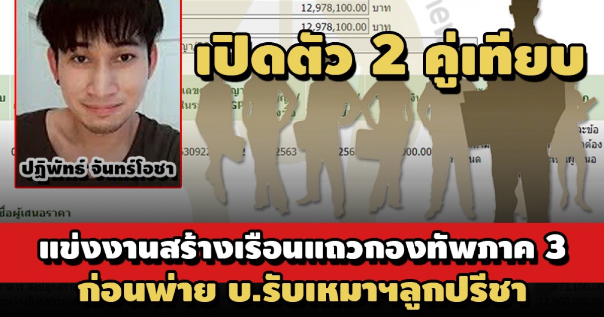 เปิดตัว 2 เอกชนคู่เทียบแข่งงานประกวดสร้างเรือนแถวทหารชั้นประทวน 10 ครอบครัว กองทัพภาคที่ 3 หจก.ขิมเขียน คู่สัญญา ทบ.ทั้งหมด 49 สัญญา 186 ล้าน บ.บ้าน ม่วนใจ๋ฯ คว้างานรัฐ 11 สัญญา 34 ล้านเศษ ก่อนพ่าย บ.พี-ไรท์แอนด์บริส ‘ปฏิพัทธ์ จันทร์โอชา’