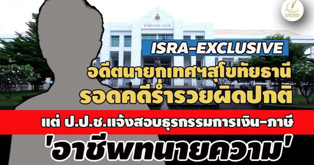ISRA-EXCLUSIVE : นายพิเชฐ ไทยกล้า เมื่อครั้งดำรงตำแหน่งสมาชิกสภาเทศบาลเมืองสุโขทัยธานี และดำรงนายกเทศมนตรีเมืองสุโขทัยธานี ถูกคณะกรรมการป้องกันและปราบปรามการทุจริตแห่งชาติ (ป.ป.ช.) ตีตกข้อกล่าวหาร่ำรวยผิดปกติ แต่ถูกส่งเรื่องให้ สำนักงานป้องกันและปราบปรามการฟอกเงิน (ปปง.) ตรวจสอบธุรกรรมทางการเงิน และแจ้งกรมสรรพากร ดำเนินการทางภาษี กรณีที่มีเงินได้จากการประกอบอาชีพทนายความ