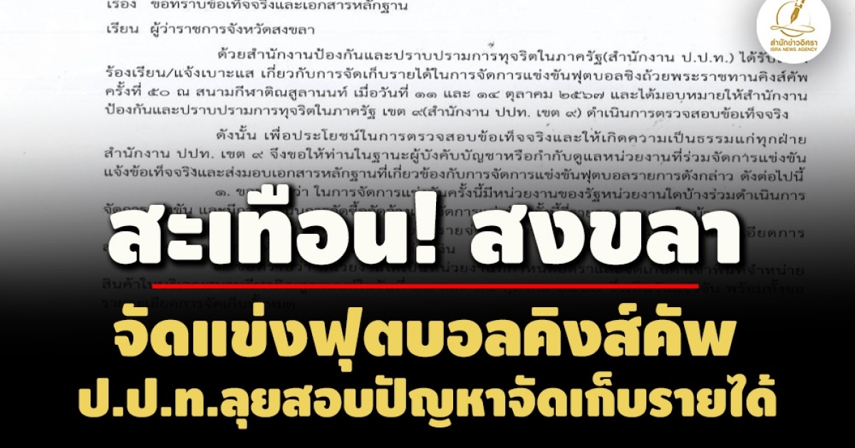 แข่งฟุตบอลชิงถ้วยพระราชทานคิงส์คัพ ครั้งที่ 50 งานเข้า! โดนร้องเรียนเรื่องจัดเก็บรายได้ ป.ป.ท.ภาค 9 ทำหนังสือแจ้งผู้ว่าฯ สงขลา ขอทราบข้อเท็จจริงเอกสารหลักฐานทั้งหมด หน่วยงานรัฐไหนร่วมบ้าง จัดซื้อจ้างกี่รายการ ตัวเลขรายรับจ่าย การสนับสนุนภาคเอกชน ใครกำหนดอัตราจัดเก็บค่าเช่าพื้นที่ขายสินค้า วันที่ 11, 14 ต.ค.2567 พร้อมทั้งขอรายละเอียดการจัดเก็บทั้งหมด เผยชื่อคณะทำงาน ผู้เกี่ยวข้องยกจังหวัด