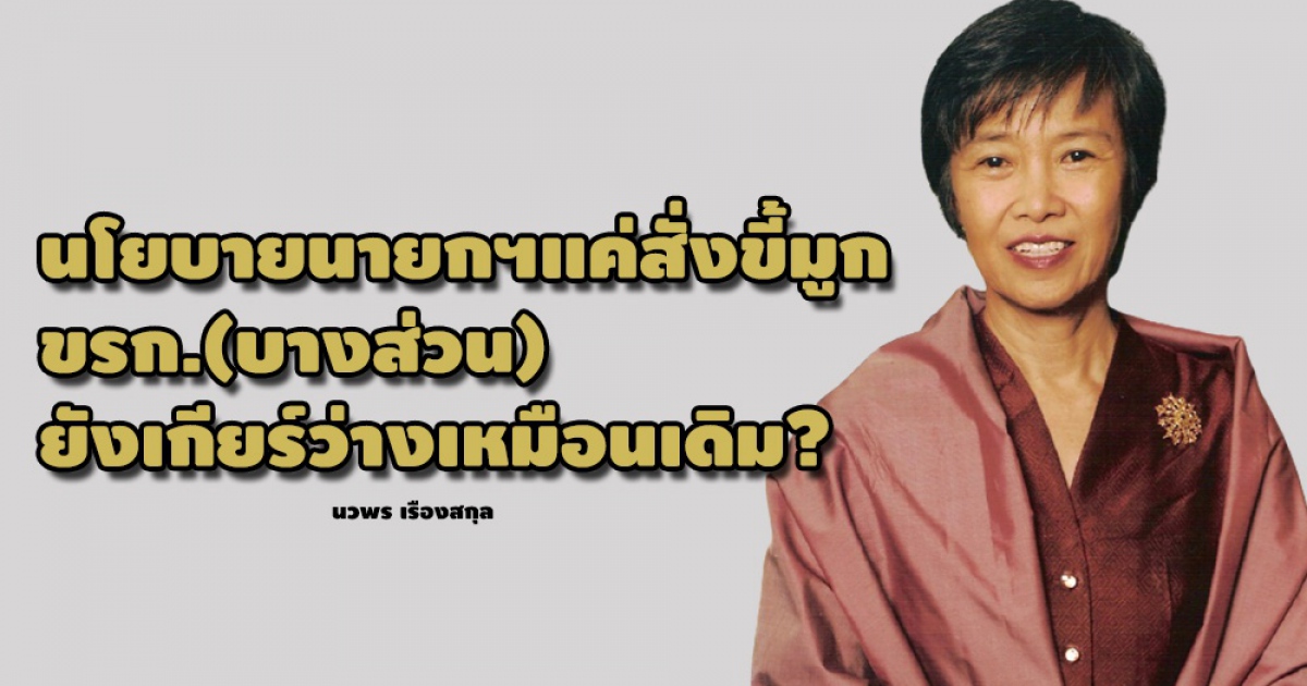 ปัญหาของประเทศไทยในเวลานี้ใหญ่หลวงนัก นายกรัฐมนตรีสั่งการไปก็หลายเรื่อง แต่เท่าที่ดิฉันในฐานะประชาชนคนหนึ่งติดตามดู รู้สึกถึงความล่าช้าอืดเอื่อยแถมบางครั้งก็ไม่ไปทางเดียวกันของคนในราชการที่ท่านเป็นผู้บังคับบัญชา นโยบายที่สั่งก็เหมือนสั่งขี้มูก