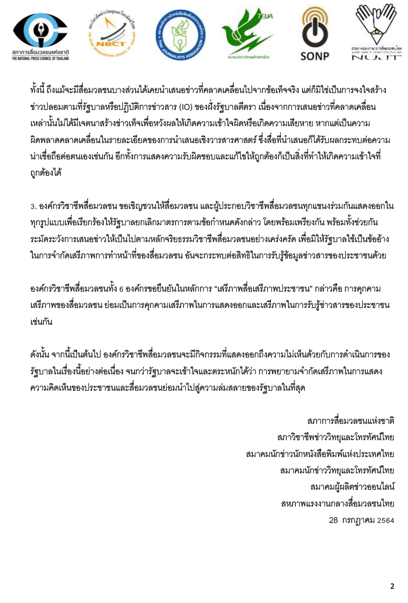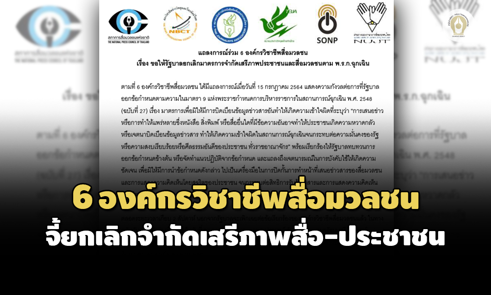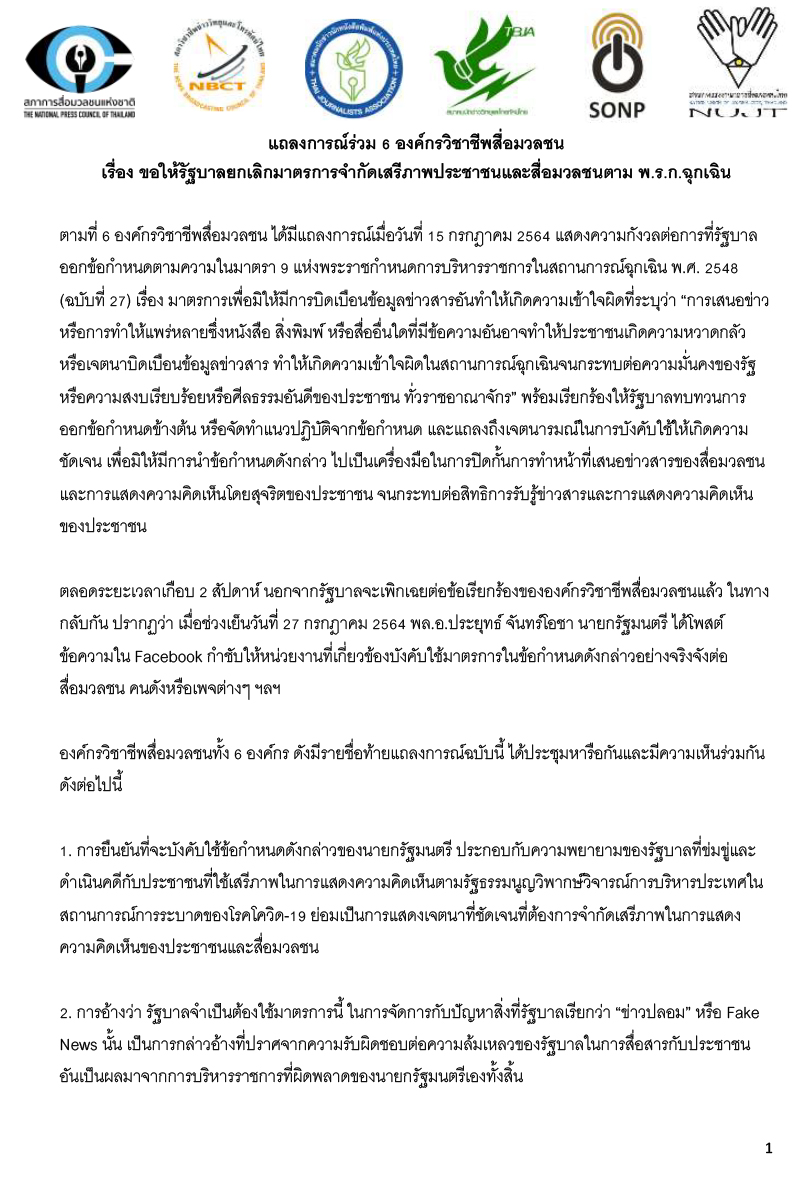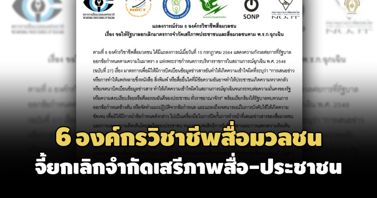 ตามที่ 6 องค์กรวิชาชีพสื่อมวลชน ได้มีแถลงการณ์เมื่อวันที่ 15 กรกฎาคม 2564 แสดงความกังวลต่อการที่รัฐบาลออกข้อกำหนดตามความในมาตรา 9 แห่งพระราชกำหนดการบริหารราชการในสถานการณ์ฉุกเฉิน พ.ศ. 2548 (ฉบับที่ 27) เรื่อง มาตรการเพื่อมิให้มีการบิดเบือนข้อมูลข่าวสารอันทำให้เกิดความเข้าใจผิดที่ระบุว่า “การเสนอข่าวหรือการทำให้แพร่หลายซึ่งหนังสือ สิ่งพิมพ์ หรือสื่ออื่นใดที่มีข้อความอันอาจทำให้ประชาชนเกิดความหวาดกลัว หรือเจตนาบิดเบือนข้อมูลข่าวสาร ทำให้เกิดความเข้าใจผิดในสถานการณ์ฉุกเฉินจนกระทบต่อความมั่นคงของรัฐ หรือความสงบเรียบร้อยหรือศีลธรรมอันดีของประชาชน ทั่วราชอาณาจักร” พร้อมเรียกร้องให้รัฐบาลทบทวนการออกข้อกำหนดข้างต้น หรือจัดทำแนวปฏิบัติจากข้อกำหนด และแถลงถึงเจตนารมณ์ในการบังคับใช้ให้เกิดความชัดเจน เพื่อมิให้มีการนำข้อกำหนดดังกล่าว ไปเป็นเครื่องมือในการปิดกั้นการทำหน้าที่เสนอข่าวสารของสื่อมวลชนและการแสดงความคิดเห็นโดยสุจริตของประชาชน จนกระทบต่อสิทธิการรับรู้ข่าวสารและการแสดงความคิดเห็นของประชาชน