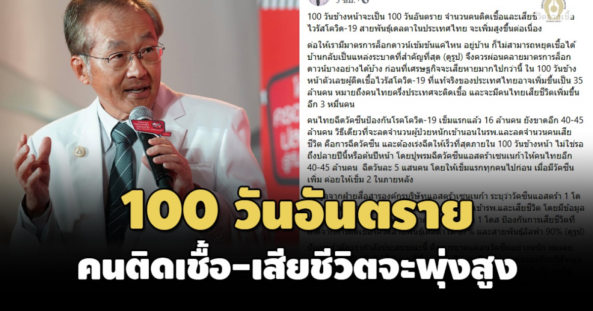 100 วันข้างหน้าจะเป็น 100 วันอันตราย จำนวนคนติดเชื้อและเสียชีวิตจากเชื้อไวรัสโควิด-19 สายพันธุ์เดลตาในประเทศไทย จะเพิ่มสูงขึ้นต่อเนื่อง