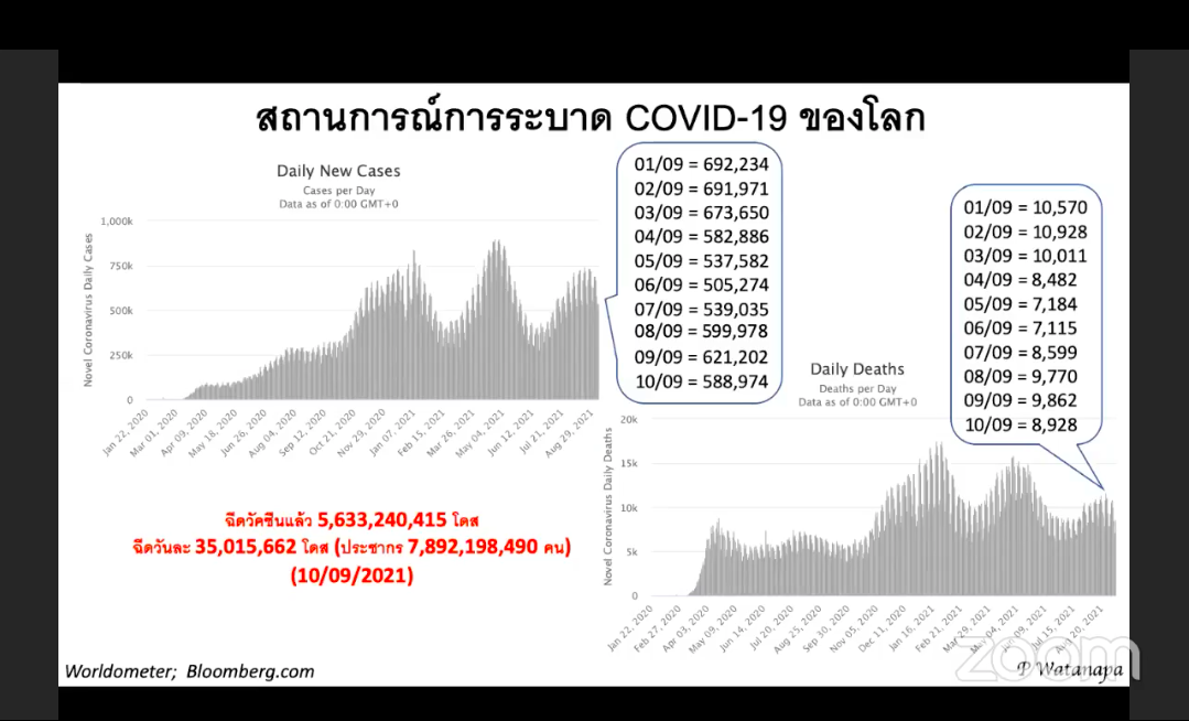 ศ.ดร.นพ.ประสิทธิ์ กล่าวอีกว่า หากดูกราฟสถานการณ์การระบาดของโลก จะพบว่าในช่วงเดือน มิ.ย.2564 เป็นช่วงที่หลายประเทศเริ่มฉีดวัคซีนจำนวนมาก และยังไม่มีสายพันธุ์เดลต้าเข้ามา กราฟยอดผู้ติดเชื้อลดลงไปอยู่ช่วงหนึ่ง ลดลงมาจาก 800,000 ราย เหลืออยู่ที่ประมาณ 300,000 รายต่อวัน และอัตราผู้เสียชีวิตก็ลดลงมาจากหลักหมื่นราย เหลือ 3,000 รายต่อวัน แต่หลังจากนั้นเมื่อเชื้อโควิดสายพันธุ์เดลต้ากระจายไปในหลายๆ ประเทศ ทำให้ยอดผู้ติดเชื้อรายใหม่เพิ่มขึ้นมาอยู่ที่ประมาณ 600,000 ต่อราย แต่อัตราผู้เสียชีวิตกลับไม่ได้เพิ่มสูงขึ้นเหมือนยอดผู้ติดเชื้อรายใหม่ ซึ่งเป็นผลมาจากฉีดวัคซีน โดยปัจจุบันฉีดวัคซีน 5,633,240,415 โดส คิดเป็นค่าเฉลี่ยฉีดได้วันละประมาณ 35,015,662 โดส จากประชากรทั้งหมด 7,892,198,490 คน