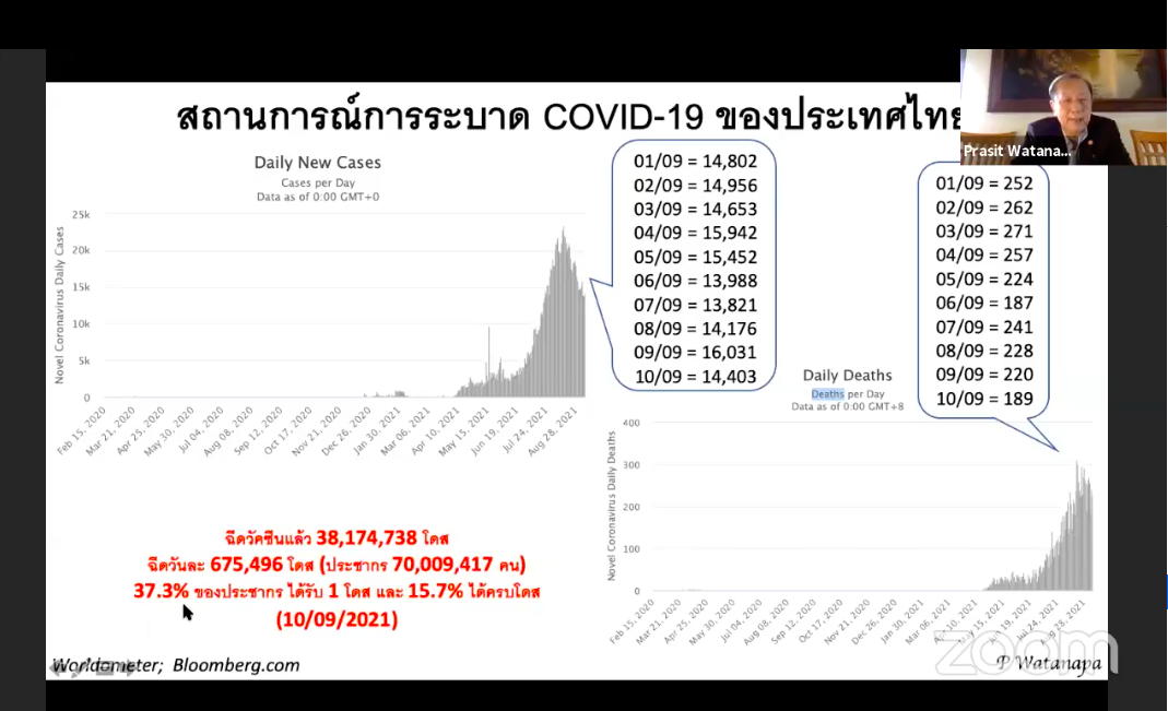 "…สถานการณ์ทั่วโลกตอนนี้สะท้อนให้เห็นว่าสายพันธุ์เดลต้า ไม่เพียงแพร่ระบาดได้เร็ว แต่ก่อให้เกิดคอาการที่รุนแรงและอันตรายมากกว่าสายพันธุ์เดิม โดยเฉพาะกับผู้ที่ไม่ได้รับวัคซีน นอกจากนี้ยังพบการติดเชื้อในเด็กเพิ่มมากขึ้นด้วย ที่สำคัญในการลดการแพร่ระบาดและอัตราการเสียชีวิตจะต้องมีสัดส่วนของประชากรที่ได้รับวัคซีนที่มากพอ ประมาณ 50% ขึ้นไป โดยหลายประเทศส่วนใหญ่คล้ายกันคือฉีดวัคซีนในกลุ่มเสี่ยงก่อน คือปล่อยให้การติดเชื้อเพิ่มขึ้นได้ แต่ขออย่าให้เสียชีวิต ซึ่งขณะนี้ประเทศไทยก็ทำเหมือนกัน และยังคงต้องรักษามาตรการส่วนบุคคล…."