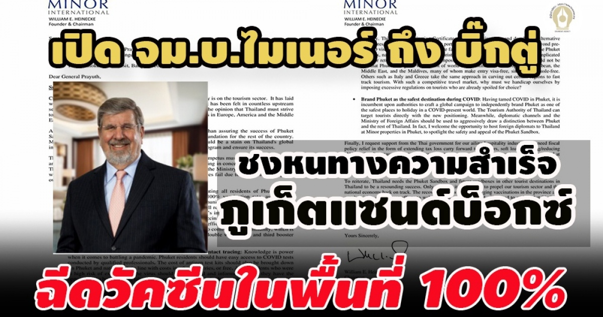 หมายเหตุสำนักข่าวอิศรา (www.isranews.org) : สืบเนื่องจากปัญหาการแพร่ระบาดเชื้อไวรัสโควิด-19 หรือโคโรน่าไวรัส ในประเทศไทย นายวิลเลี่ยม เอ็ลล์วู๊ด ไฮเน็ค ผู้ก่อตั้งบริษัท ไมเนอร์ อินเตอร์เนชั่นแนล จำกัด (มหาชน) ซึ่งเป็นกลุ่มบริษัทดำเนินธุรกิจหลักในด้านการลงทุนการประกอบกิจการโรงแรม ภัตตาคาร อาหารและเครื่องดื่ม การจัดจำหน่ายและผลิตสินค้า โดยประกอบกิจการส่วนใหญ่ในประเทศไทย ได้ทำจดหมายเปิดผนึกถึง พล.อ.ประยุทธ์ จันทร์โอชา นายกรัฐมนตรี ถึงความจำเป็นและหนทางรับรองความสำเร็จภูเก็ตแซนด์บ็อกซ์