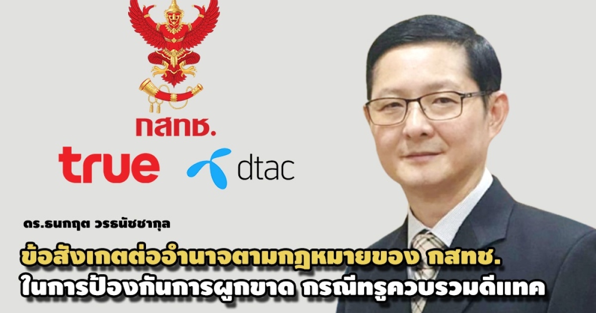 ตามที่มีข่าวปรากฏเป็นที่ทราบกันทั่วไปว่า บริษัทค่ายมือถือของทรูและดีแทคได้ประกาศจะดำเนินการควบรวมธุรกิจโทรศัพท์มือถือระหว่างกัน เพื่อปรับโครงสร้างธุรกิจไปสู่การเป็นบริษัทเทคโนโลยี (เทคคอมปะนี) นั้น ในเรื่องการควบรวมธุรกิจของ 2 ค่ายบริษัทมือถือนี้เกี่ยวข้องกับประชาชนจำนวนมากที่มีความจำเป็นต้องใช้บริการโทรศัพท์มือถือ และเรื่องที่สังคมจับตามองด้วยความเป็นห่วงกังวลคือ การควบรวมธุรกิจของทรูกับดีแทค จะก่อให้เกิดการผูกขาดและกระทบต่อการแข่งขันของธุรกิจการให้บริการโทรศัพท์มือถือและจะกระทบต่อผู้บริโภคอย่างไร