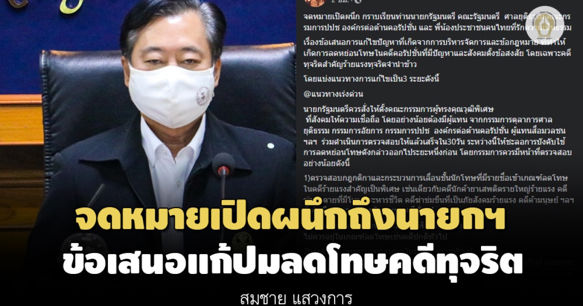 หมายเหตุสำนักข่าวอิศรา (www.isranews.org) นายสมชาย แสวงการ สมาชิกวุฒิสภา (ส.ว.) เขียนจดหมายเปิดผนึกถึงนายกรัฐมนตรี รวมถึงหน่วยงานที่เกี่ยวข้อง ผ่าน สมชาย แสวงการ เพื่อเสนอแนวทางแก้ปัญหาการลดหย่อนโทษคดีทุจริต