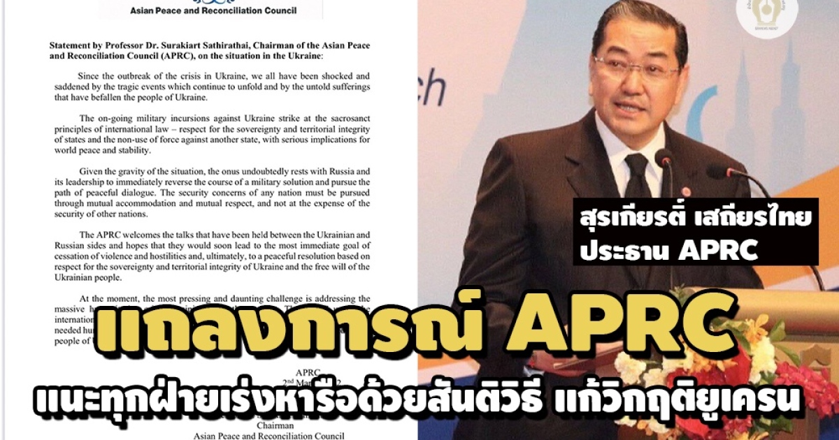 หมายเหตุ:นายสุรเกียรติ์ เสถียรไทย ประธานสันติภาพแห่งเอเชียและสภาสมานฉันท์ (APRC) ได้ออกแถลงการณ์เกี่ยวกับสถานการณ์การสู้รบในประเทศยูเครน ซึ่งสำนักข่าวอิศรา (www.isranews.org) ได้ถอดเอาแถลงการณ์ดังกล่าวมาโดยละเอียดมีใจความดังต่อไปนี้