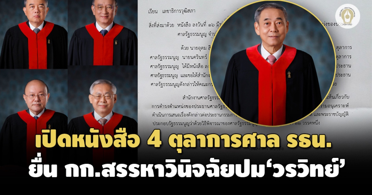 - ยื่นทันที! 4 ตุลาการร้อง กก.สรรหาวินิจฉัยปม'วรวิทย์'พ้นเก้าอี้ประธานศาล รธน.หรือไม่