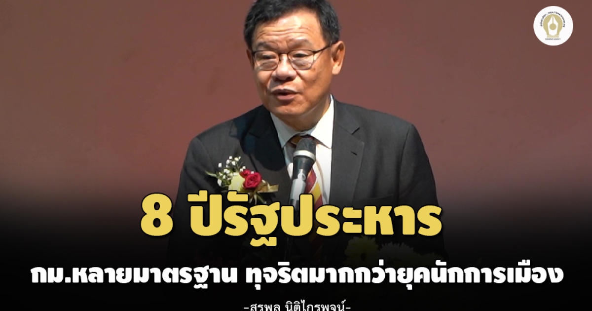 “เราเห็นการบังคับใช้กฎหมายที่อาจไม่ใช่ 2 มาตรฐาน แต่มีหลายมาตรฐานขึ้นอยู่กับการบังคับใช้กับใคร เราเห็นการทุจริตคอร์รัปชันเกิดขึ้นในหมู่ผู้มีอำนาจ ไม่แตกต่างไปจากการทุจริตของนักการเมือง ในชีวิตจริงพวกเราตระหนักว่าการทุจริตซึ่งเคยเป็นเป้าหมายสำคัญของการรัฐประหาร ยังคงมีอยู่ ถ้าไม่พูดก็มีมากกว่าสมัยที่นักการเมืองปกครองประเทศ ความแตกต่างสำคัญคือในอดีตเรามีองค์กรตรวจสอบจับนักการเมืองเข้าคุก แต่ปัจจุบันเรามีกลไกเช่นนั้นสำหรับนักการเมืองหรือผู้มีความคิดตรงกันข้ามกับผู้มีอำนาจรัฐเท่านั้น” ศ.ดร.สุรพล กล่าว