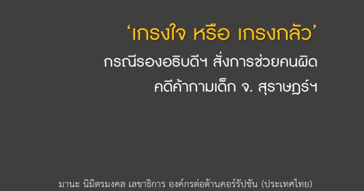"...การทำเรื่องเลวร้ายแบบนี้จะด้วยเกรงใจหรือเกรงกลัวก็เป็นเรื่องผิด แต่ที่น่ากลัวกว่านั้นคือ เมื่อเจ้าหน้าที่รัฐทำตัวเป็นผู้ร้ายเสียเอง อย่างนี้เราจะปกป้องเด็กและเยาวชนได้อย่างไร คนที่กล้าคอร์รัปชันต่อหน้าที่อย่างไร้ยางอายกันขนาดนี้ สังคมไทยต้องไม่ปล่อยให้ลอยนวลไปง่ายๆ ครับ..."