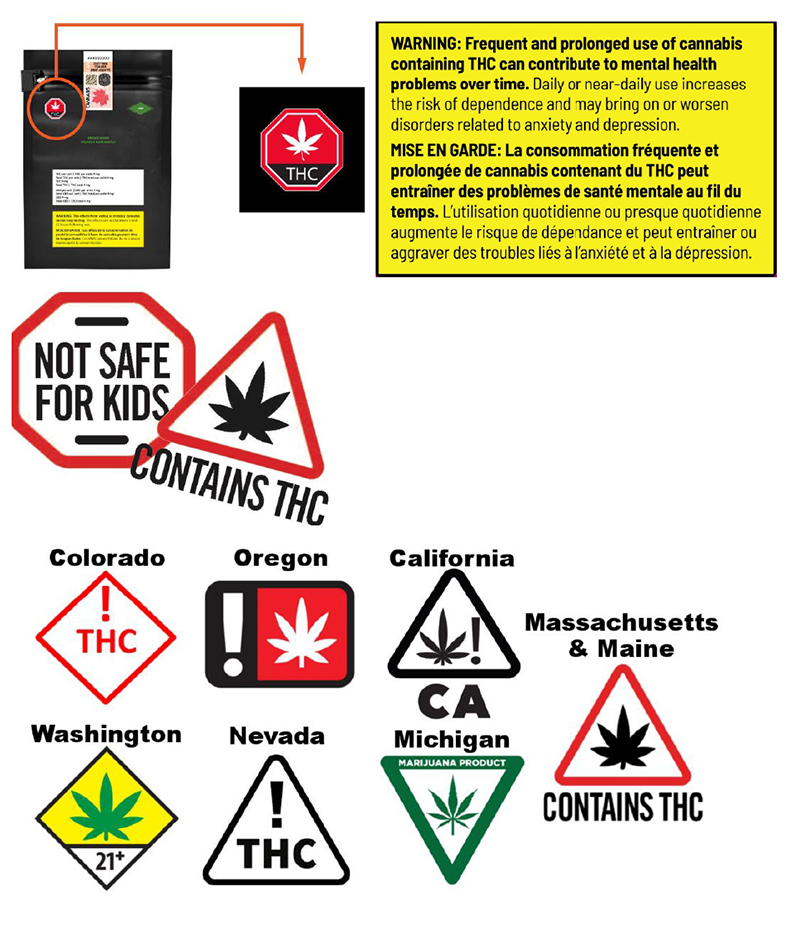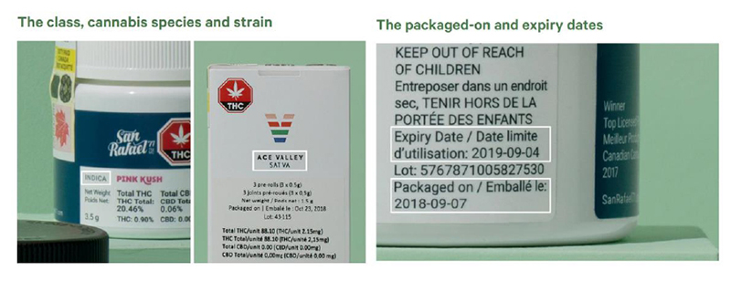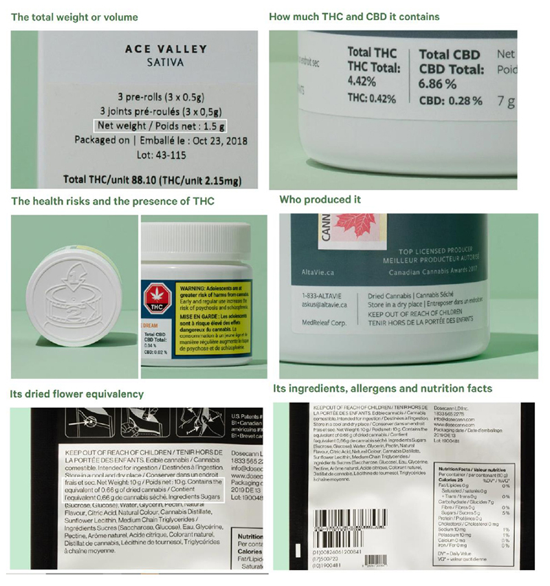 บรรจุภัฑณ์ของผลิตภัณฑ์กัญชา จะต้องแสดงข้อมูลรายละเอียดให้ผู้ซื้อเข้าใจตัวผลิตภัณฑ์ให้มากที่สุด เช่น สายพันธุ์กัญชา วันที่บรรจุและวันที่หมดอายุ ปริมาณผลิตภัณฑ์ ปริมาณ THC และ CBD คำเตือน ผู้ผลิต ปริมาณเทียบเท่ากับกัญชาแห้ง (ซึ่งจะทำให้ทราบได้ว่าเกินกว่าที่กฎหมายกำหนดหรือไม่) และ สารประกอบอื่นและสารอาหารที่มีในผลิตภัณฑ์
