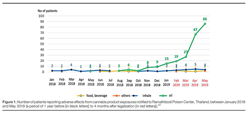 3. จากการศึกษาว่าประเทศไทยมีจำนวนผู้ใช้กัญชาเพื่อนันทนาการ (ใช้เพื่อความสนุกสนุน ใช้เพื่อความเมา) อยู่จำนวนเท่าใด โดยศูนย์ศึกษาปัญหาการเสพติด (ศศก.) ซึ่งทำการสำรวจประชากรที่เป็นตัวแทนประชาชนไทยอายุ 18 ปีขึ้นไปทั่วประเทศ พบว่า หลังจากที่กระทรวงสาธารณสุขปลด “ใบ/ราก/ต้น/ชิ้นส่วนอื่นๆ” ของกัญชาจากการเป็นยาเสพติด โดยการออกประกาศกระทรวงสาธารณสุข เรื่องระบุชื่อยาเสพติดให้โทษในประเภท 5 ฉบับลงนามวันที่ 8 ธันวาคม พ.ศ. 2563 ประเทศไทยมีจำนวนผู้ใช้กัญชาเพื่อนันทนาการอย่างน้อยหนึ่งครั้งในรอบหนึ่งปีที่ผ่านมา จากจำนวนกว่า 1 ล้านคนในปี พ.ศ. 2562 เป็น จำนวนถึง 1.9 ล้านคน (ซึ่งคิดเป็นความชุกร้อยละ 4.3 ชองประชากรไทย) ในปีพ.ศ. 2564 หรือ คิดเป็นเพิ่มเป็นประมาณเกือบสองเท่าตัว นอกจากนี้ ข้อมูลจากหน่วยพิษของโรงพยาบาลรามาธิบดีจากช่วงเดือนมกราคม พ.ศ. ๒๕๖๑ ถึง เดือนพฤษภาคม พ.ศ. 2562 (ประเทศไทยมีนโยบายกัญชาทางการแพทย์ในประเทศไทย เริ่ม 18 กุมภาพันธ์ พ.ศ. 2562) พบว่ามีจำนวนผู้ป่วยที่มีอาการที่ไม่พึงประสงค์จากการใช้ผลิตภัณฑ์กัญชา (เช่น เมา ซึ่งอาจเกิดจากการใช้ในปริมาณที่มากกว่าแพทย์สั่ง หรือ การนำไปใช้เพื่อนันทนาการโดยตั้งใจ) มากขึ้นมากหลังจากที่มีนโยบายกัญชาทางการแพทย์ในประเทศไทย (ดูภาพที่ 1 ข้างล่างนี้) จึงมีความน่าเป็นห่วงว่าหากไม่มีมาตรการควบคุมการใช้กัญชาในทางที่ผิด (ใช้เพื่อนันทนาการ) ที่เพียงพอ ประเทศไทยจะมีผู้ใช้กัญชาการในทางที่ผิดเพิ่มอีกเท่าใด หลังจากที่มีการปลดช่อดอกกัญชาจากการเป็นยาเสพติดเมื่อครบ 120 วัน ในวันที่ 9 มิถุนายน พ.ศ. 2565 ที่จะถึงนี้