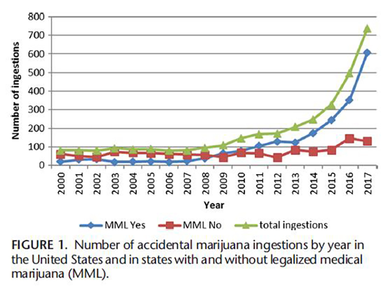 นอกจากนั้น ยังมีผลกระทบที่ไม่คาดคิดอีกประการหนึ่ง คือ การรับประทานกัญชาโดยไม่ได้ตั้งใจในเด็กอายุต่ำกว่า 6 ปี Lubitz et al. (2020) ศึกษาการรับประทานกัญชาโดยไม่ได้ตั้งใจในเด็กอายุต่ำกว่า 6 ปี เปรียบเทียบระหว่างรัฐที่มีนโยบายกัญชาทางการแพทย์และรัฐที่ไม่มีนโยบายกัญชาทางการแพทย์ ในประเทศสหรัฐอเมริกา โดยใช้ฐานข้อมูลระดับประเทศเกี่ยวกับการได้รับพิษ (National Poison Data System) ระหว่างปี 2000 ถึง 2017 พบว่าจำนวนเด็กที่ทานกัญชาโดยไม่ได้ตั้งใจเริ่มเพิ่มขึ้นในปี 2009 และเพิ่มขึ้นปีละร้อยละ 27 ขึ้นไปจนถึง 742 คนต่อปีในปี 2017 จากการที่จำนวนผู้ป่วยเด็กที่ทานกัญชาโดยไม่ได้ตั้งในมีจำนวนคงที่ในระดับต่ำกว่า 100 ราย/ปีในช่วงปี 2000-2009 ดังรูปภาพที่ 2