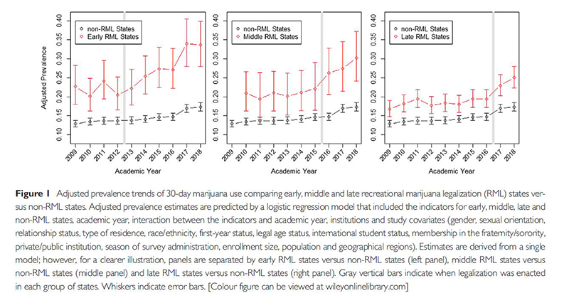 4. Bae and Kerr (2020) ทำการศึกษาพฤติกรรมการใช้กัญชาในช่วง 30 วันที่ผ่านมาของเยาวชน โดยใช้ข้อมูลการสำรวจสุขภาพในกลุ่มนักศึกษาในระดับอุดมศึกษาใน 587 แห่ง ใน 48 รัฐในประเทศสหรัฐอเมริกา ซึ่งดำเนินการสำรวจปีละสองครั้งตั้งแต่ปี 2009-2018 รวมเป็นผู้ตอบแบบสอบถามทั้งหมด 234,669 คนในรัฐที่มีกฎหมายอนุญาตให้ใช้กัญชาเสรีเพื่อนันทนาการได้ และ 599,605 คนนัฐที่ยังไม่มีกฎหมายนี้ ผลการศึกษาพบว่า เยาวชนในรัฐที่อนุญาตให้ใช้กัญชาเพื่อนันทนาการได้มีความเสี่ยง (odds ratio) ในการใช้กัญชาอย่างน้อยหนึ่งครั้งใน 30 วันที่ผ่านมาและในการใช้บ่อย (คือใช้มากกว่า 20 วันใน 30 วัน) สูงเป็น 1.2 เท่าของเยาวชนนรัฐที่ไม่อนุญาตให้ใช้กัญชาเสรีเพื่อนันทนาการ โดยรัฐที่อนุญาตทั้งแต่ปี 2012 `จะเริ่มมีความชุกของพฤติกรรมเหล่านี้เพิ่มขึ้นตั้งแต่ปีที่สองจนถึงปีที่หกหลังอนุญาติ รัฐที่อนุญาตตั้งแต่ปี 2015 จะเริ่มมีความชุกของพฤติกรรมเหล่านี้ตั้งแต่ปีแรกหลังอนุญาตและเพิ่มขึ้นทุกปี ส่วนรัฐที่อนุญาตทีหลังคือระหว่างปี 2016-2017 ก็มีความชุกของพฤติกรรมเหล่านี้เพิ่มขึ้นทันทีเช่นกัน ดังรูปที่ 3 จากซ้ายไปขวา คือ รัฐที่อนุญาตตั้งแต่ปี 2012, 2015 และ 2016-2017 ตามลำดับ