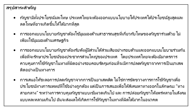 สรุป คือ กัญชามีทั้งประโยชน์และโทษ ประเทศไทยจะต้องออกแบบนโยบายให้ประเทศได้ประโยชน์สูงสุดและลดโทษที่อาจเกิดขึ้นให้ได้มากที่สุด
