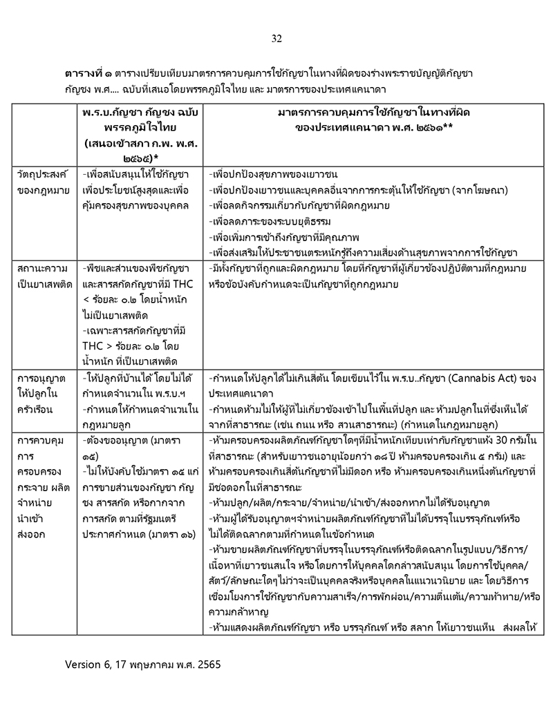 เอกสารฉบับนี้ได้ทำการเปรียบเทียบมาตรการควบคุมการใช้กัญชาในทางที่ผิดที่ระบุไว้ในร่างพระราชบัญญัติ กัญชา กัญชง พ.ศ.... ที่เสนอโดยพรรคภูมิใจไทย กับ มาตรการควบคุมการใช้กัญชาในทางที่ผิดของประเทศแคนาดา และ เปรียบเทียบกับมาตรการควบคุมการบริโภคยาสูบในประเทศไทย เพื่อที่จะดูว่ามาตรการที่เสนอไว้มีความเข้มงวดหรือหละหลวมหรือไม่อย่างไร (ดูตารางที่ 1 ประกอบ)