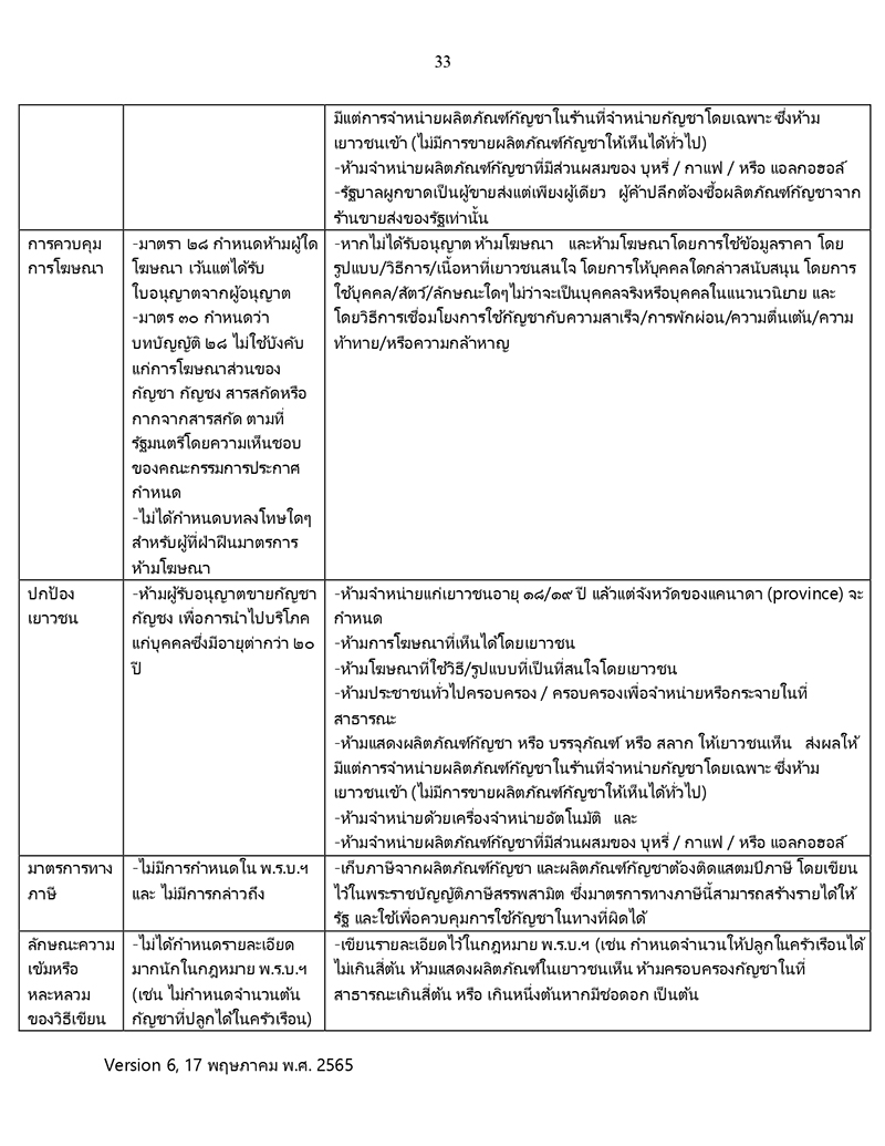 6) การปกป้องเยาวชนและกลุ่มเสี่ยงอื่น: ประเทศแคนาดา กำหนดห้ามจาหน่ายแก่เยาวชนอายุ 18/19 ปี แล้วแต่จังหวัดของแคนาดา (province) จะกำหนด ห้ามการโฆษณาที่เห็นได้โดยเยาวชน ห้ามโฆษณาที่ใช้วิธี/รูปแบบที่เป็นที่สนใจโดยเยาวชน ห้ามประชาชนทั่วไปครอบครอง / ครอบครองเพื่อจาหน่ายหรือกระจายในที่สาธารณะ ห้ามแสดงผลิตภัณฑ์กัญชา หรือ บรรจุภัณฑ์ หรือ สลาก ให้เยาวชนเห็น ส่งผลให้มีแต่การจำหน่ายผลิตภัณฑ์กัญชาในร้านที่จำหน่ายกัญชาโดยเฉพาะ ซึ่งห้ามเยาวชนเข้า (ไม่มีการขายผลิตภัณฑ์กัญชาให้เห็นได้ทั่วไป) ห้ามจำหน่ายด้วยเครื่องจาหน่ายอัตโนมัติ และห้ามจำหน่ายผลิตภัณฑ์กัญชาที่มีส่วนผสมของ บุหรี่ / กาแฟ / หรือ แอลกอฮอล์ ขณะที่ ประเทศไทย กำหนดเพียงมาตรการห้ามผู้รับอนุญาตขายกัญชา กัญชง เพื่อการนำไปบริโภค แก่ (1) บุคคลซึ่งมีอายุต่ากว่ายี่สิบปี (2) สตรีมีครรภ์ (3) สตรีให้นมบุตร และ (4) บุคคลอื่นตามที่รัฐมนตรีประกาศกาหนด (โดยกำหนดเพียงให้ผู้รับอนุญาตขายมีหน้าที่ติดประกาศหรือแจ้ง ณ สถานที่ขาย)