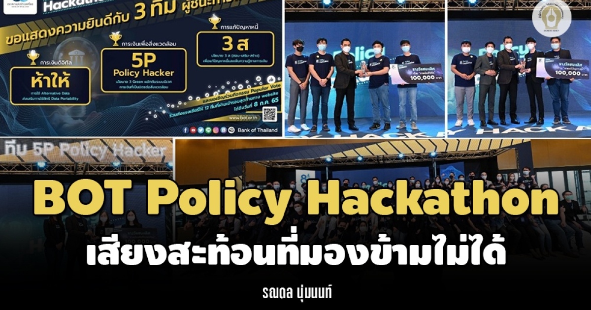 BOT Policy Hackathon ทำให้เห็นถึงพลังของคนรุ่นใหม่ ได้รับฟังมุมมองและข้อเสนอที่สร้างสรรค์ และได้รับรู้ถึง passion ของน้อง ๆ ที่ต้องการให้นำไปสู่ทางปฏิบัติ ทั้งนี้ พวกเราสามารถรับฟังตัวแทนจากทีมงานที่ชนะเลิศทั้ง 3 ด้าน มาบอกเล่าถึงข้อเสนอและความประทับใจจากกิจกรรมนี้ได้ในงาน Brown Bag ในวันที่ 5 กรกฎาคม 2565 เวลา 12.15 น. ณ ห้องภัทรรวมใจ