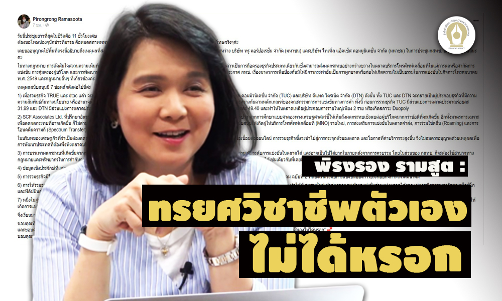 หมายเหตุ สำนักข่าวอิศรา (www.isranews.org) : ศ.ดร.พิรงรอง รามสูต กรรมการกิจการกระจายเสียง กิจการโทรทัศน์ และกิจการโทรคมนาคมแห่งชาติ (กสทช.) เขียนเฟซบุ๊กส่วนตัว ภายหลังจากที่ กสทช.ลงมติด้วยเสียง 2 ต่อ 2 ให้ควบรวมกิจการบริษัท ทรู คอร์ปอเรชั่น จำกัด (มหาชน) และบริษัท โทเทิ่ล แอ็คเซ็ส คอมมูนิเคชั่น จำกัด (มหาชน) และประธานใช้สิทธิออกเสียงอีกครั้งหนึ่งให้ควบรวมกิจการกลายเป็นเสียงมาก