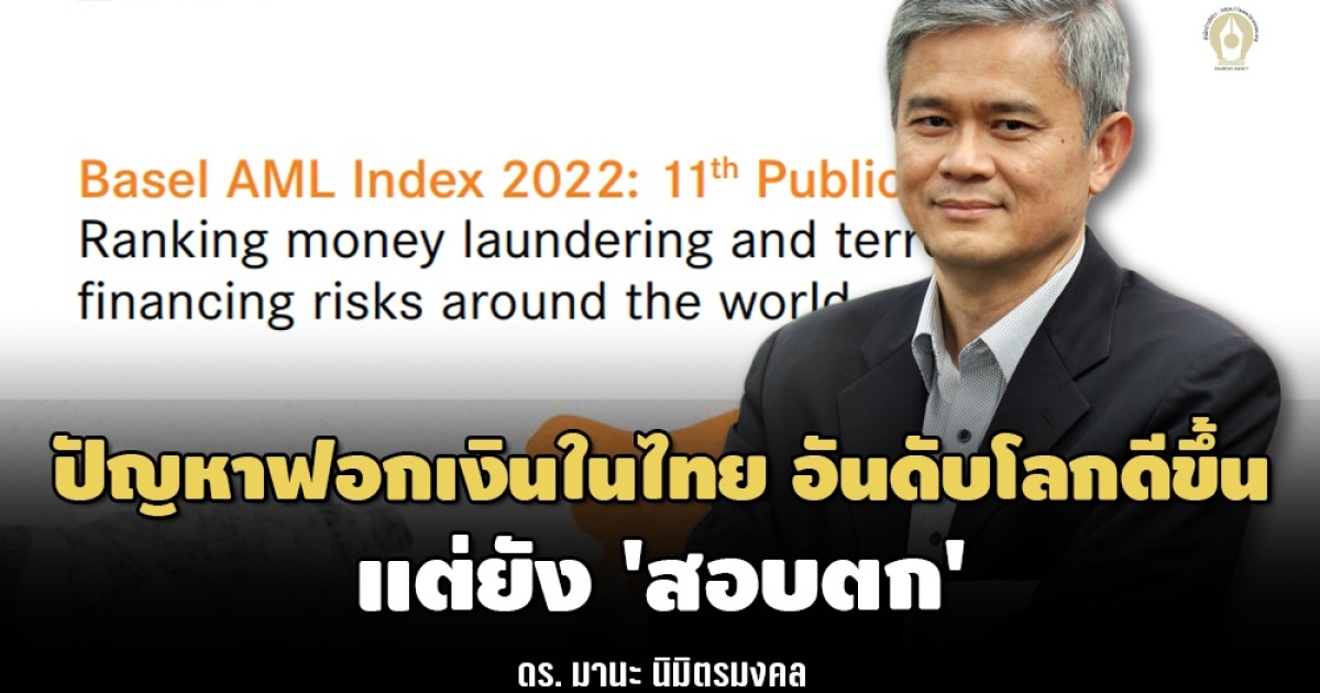 "...ประเทศไทยถูกประเมินว่า 'มีความเสี่ยงในการฟอกเงินและเป็นแหล่งเงินทุนสำหรับผู้ก่อการร้าย' มากเป็นอันดับที่ 40 ของโลกจาก 128 ประเทศ ด้วยคะแนน 5.8 จากคะแนนเต็ม 10 (คะแนนยิ่งต่ำยิ่งดี) ดีที่สุดในรอบ 11 ปี และเป็นครั้งแรกที่ได้ต่ำกว่า 6 คะแนน แต่ก็ถือว่าสอบตกและมีหลายเรื่องที่ต้องสังคายนา..."