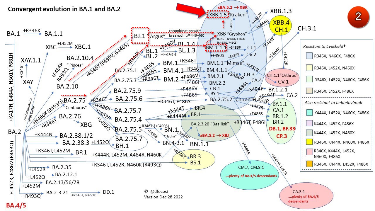 1. ต้นตระกูลของ XBB.1.5 คือโอมิครอน BA.2, เป็นสายพันธุ์ลูกผสม (recombinant) ระหว่างโอมิครอนสองสายพันธุ์คือ BJ.1 และ BM.1.1.1