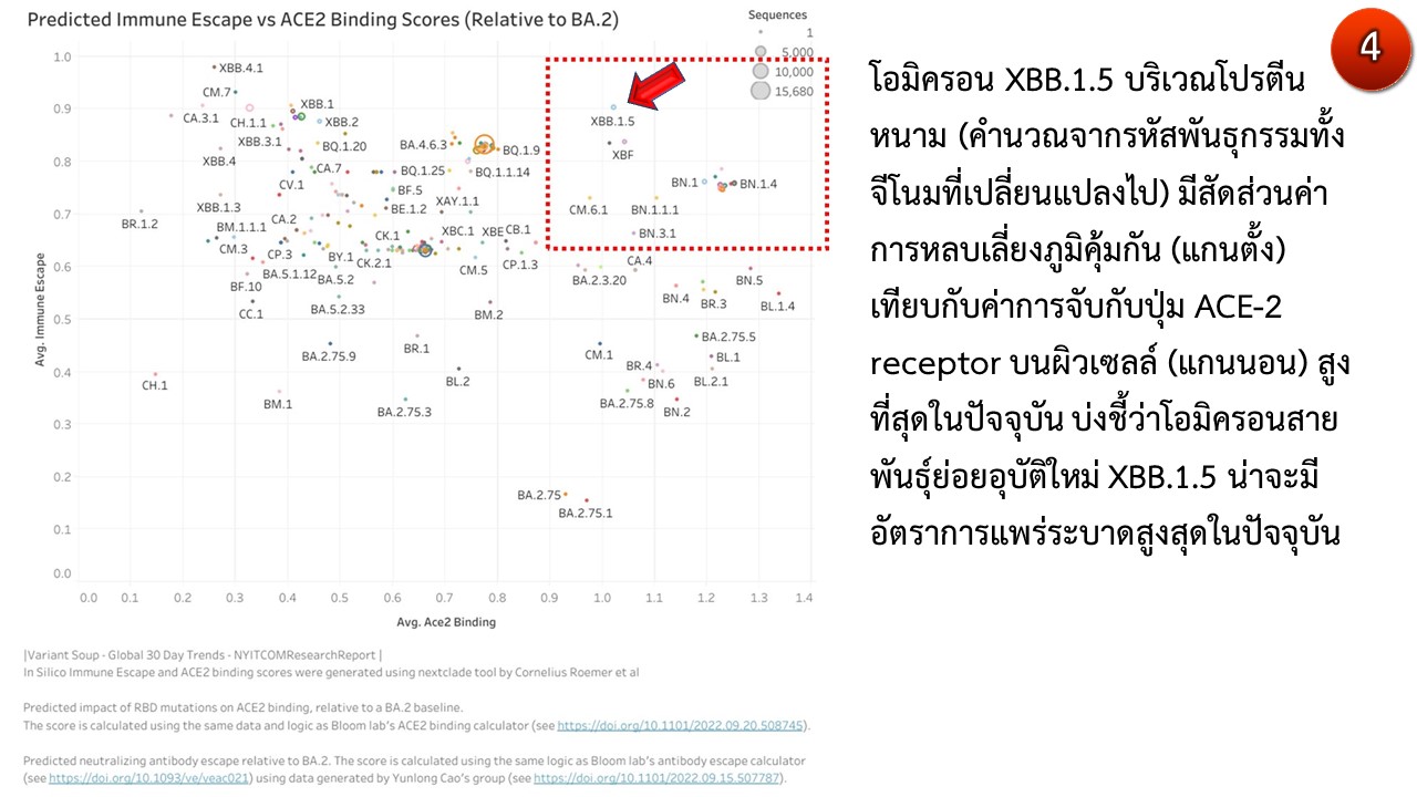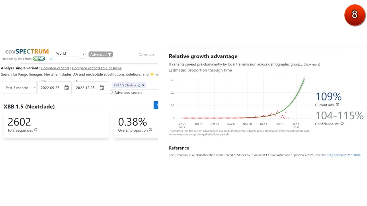 11. จากการถอดรหัสพันธุกรรมทั้งจีโนมของ XBB.1.5 ในช่วง 3 เดือนที่ผ่านมาพบว่า XBB.1.5 มีความได้เปรียบในการเติบโต-แพร่ระบาด (relative growth advantage) เหนือกว่าโอมิครอนทุกสายพันธุ์ที่แพร่ระบาดในขณะนี้ ประมาณ 109 %
