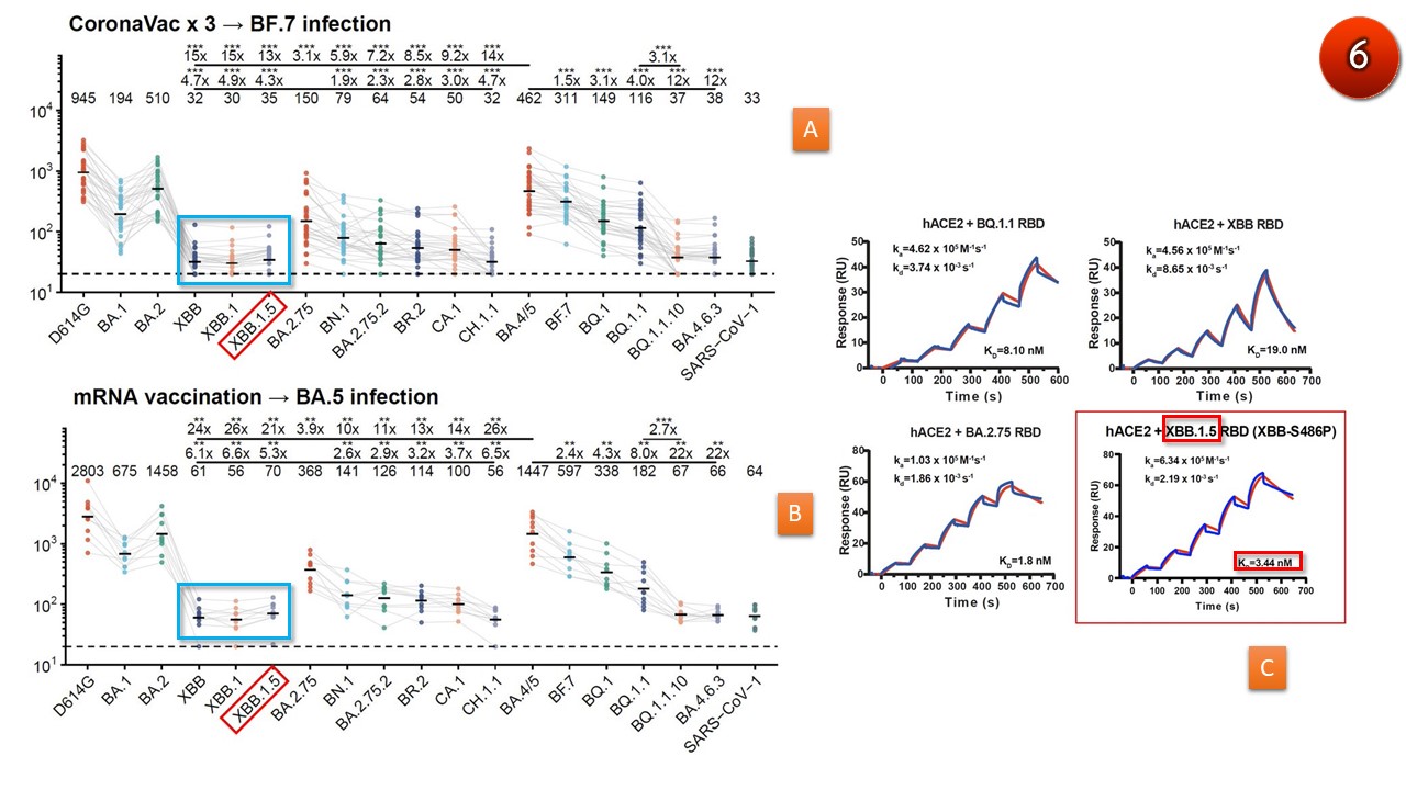 8. ภูมิคุ้มกันแบบผสมจาก“การฉีดวัคซีนเอ็มอาร์เอ็นเอ 3 เข็มตามด้วยการติดเชื้อโอมิครอน BA.5 ตามธรรมชาติ” สามารถป้องกันการติดเชื้อ XBB, XBB.1, XBB.1.5 ได้ใกล้เคียงกัน (ภาพ6B) และใกล้เคียงกับกลุ่มผู้ที่ได้รับฉีดวัคซีนเชื้อตาย 3 เข็มตามด้วยการติดเชื้อโอมิครอน BF.7 ตามธรรมชาติ แต่ยังคงต่ำกว่าสายพันธุ์ดั้งเดิม, อู่ฮั่น อย่างมีนัยสำคัญ