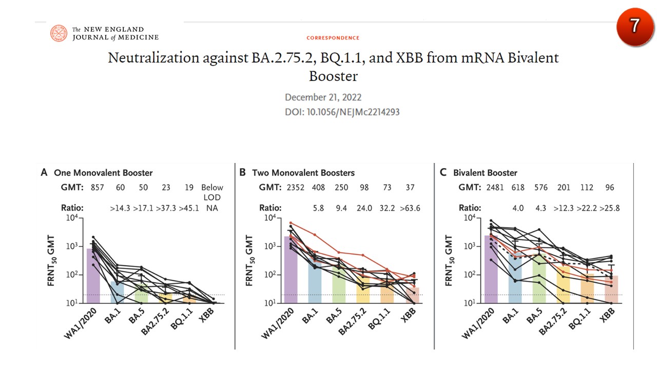10. การฉีดวัคซีนเข็มกระตุ้น เอ็มอาร์เอ็นเอรุ่นที่สอง(สองสายพันธุ์-bivalent booster) จะกระตุ้นภูมิคุ้มกันต่อ XBB ได้ดีกว่าการฉีดวัคซีนเข็มกระตุ้นรุ่นแรก(สายพันธุ์เดียว monovalent booster) จำนวนสองเข็ม และการฉีดวัคซีนเข็มกระตุ้นรุ่นแรก(สายพันธุ์เดียว monovalent booster) เพียงเข็มเดียวตามลำดับ