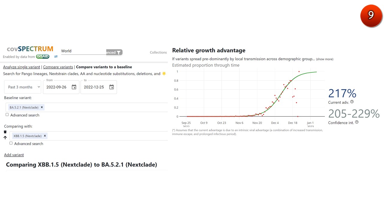 12. จากการถอดรหัสพันธุกรรมทั้งจีโนมของ XBB.1.5 ในช่วง 3 เดือนที่ผ่านมาพบว่า XBB.1.5 มีความได้เปรียบในการเติบโต-แพร่ระบาด (relative growth advantage) เหนือกว่าโอมิครอน BA.5.2.1 (ซึ่งเป็นสายพันธุ์หลักแพร่ระบาดในหลายประเทศขณะนี้)ประมาณ 217 %