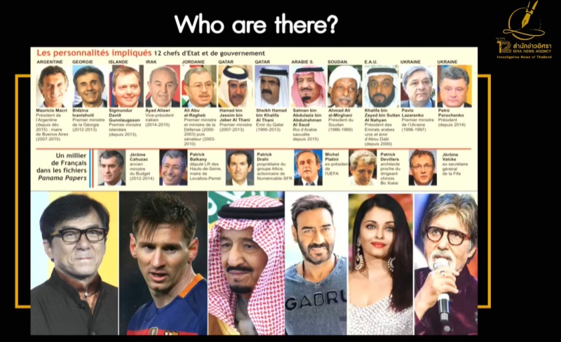 เอกสารที่อยู่ในฐานข้อมูลปานามา เปเปอร์สมีอะไรบ้าง เราพบเห็นว่ามีหนังสือเดินทางของกษัตริย์จอร์แดน ที่พระองค์ทรงใช้บริษัทนอกอาณาเขตไปซื้ออพาร์ตเม้นหรู ในประเทศอังกฤษ มีเอกสารการตอบโต้กันระหว่างบริษัทแห่งหนึ่งที่ใหญ่มากในสหรัฐอเมริกา และมีแม้กระทั่งลายเซ็น ลีโอเนล เมสซี่ ที่ีมีบริษัทนอกอาณาเขตและก็ถูกสอบสวนด้วยในกรณีนี้