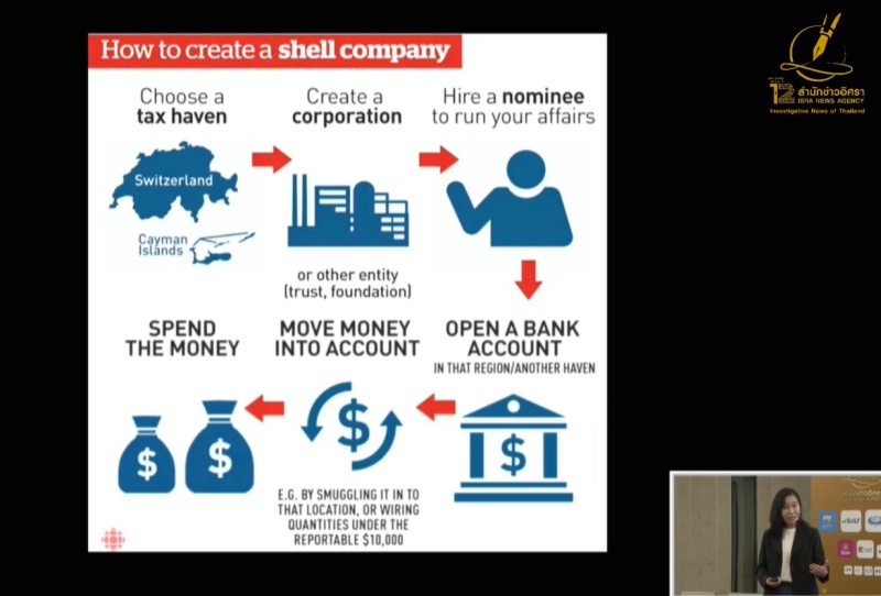 ดิฉันเองในฐานะของสมาชิก ICIJ ได้ร่วมมือกับสำนักข่าวอิศราในการทำข่าวขุดคุ้ยข้อมูลจากฐานข้อมูลขนาดใหญ่ของกลไกการทำธุรกรรมทางการเงินระหว่างประเทศ ที่มีอยู่มาเป็นระยะเวลา 100 กว่าปีแล้วแต่เพิ่งจะมีการตีแผ่เมื่อไม่กี่ปีมานี้ กลไกที่ว่านี้คือออฟชอร์คอมปี ออฟชอร์เอ็นติตี้ หรือที่เรียกกันว่าบริษัทนอกอาณาเขต ปานามเปเปอร์สมาจากฐานข้อมูลที่ใหญ่มาก มาจากฐานข้อมูลที่ใหญ่มากของสำนักกฎหมายที่รับจดทะเบียนบริษัทนอกอาณาเขตที่มีสาขาอยู่ในหลายประเทศทั่วโลกรวมถึงที่ประเทศไทยด้วย