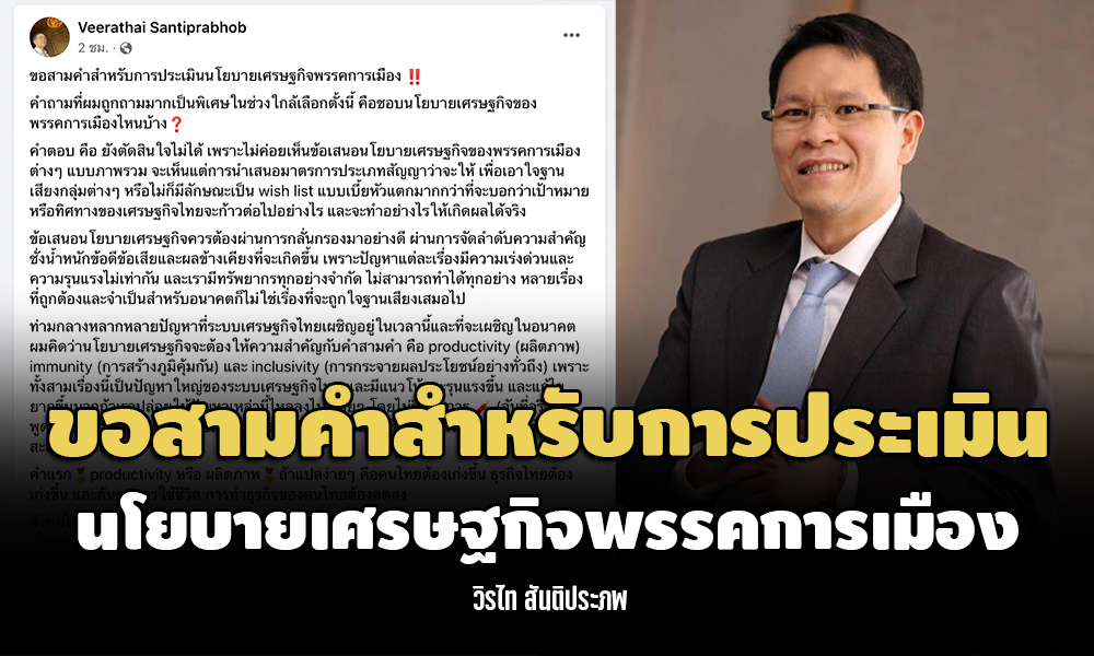 "...ท่ามกลางหลากหลายปัญหาที่ระบบเศรษฐกิจไทยเผชิญอยู่ในเวลานี้และที่จะเผชิญในอนาคต ผมคิดว่านโยบายเศรษฐกิจจะต้องให้ความสำคัญกับคำสามคำ คือ productivity (ผลิตภาพ) immunity (การสร้างภูมิคุ้มกัน) และ inclusivity (การกระจายผลประโยชน์อย่างทั่วถึง) เพราะทั้งสามเรื่องนี้เป็นปัญหาใหญ่ของระบบเศรษฐกิจไทย และมีแนวโน้มจะรุนแรงขึ้น และแก้ไขยากขึ้นมากถ้าเราปล่อยให้ปัญหาเหล่านี้ไหลลงไปเรื่อยๆ โดยไม่รีบจัดการ..."